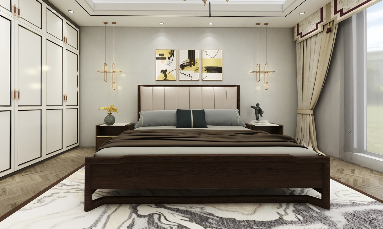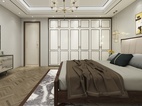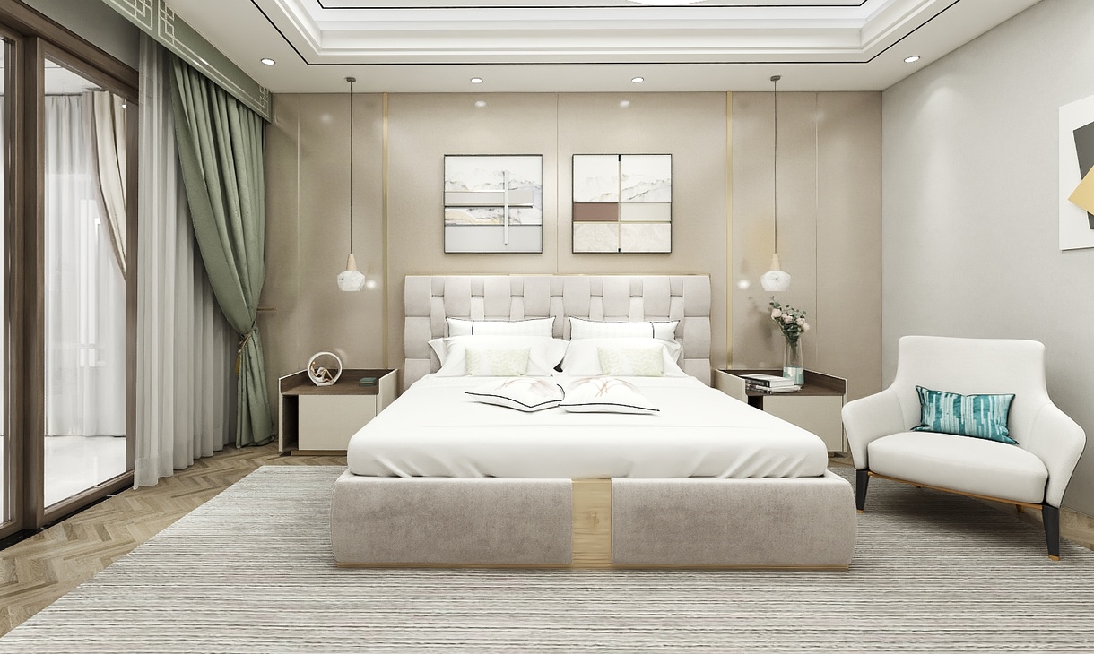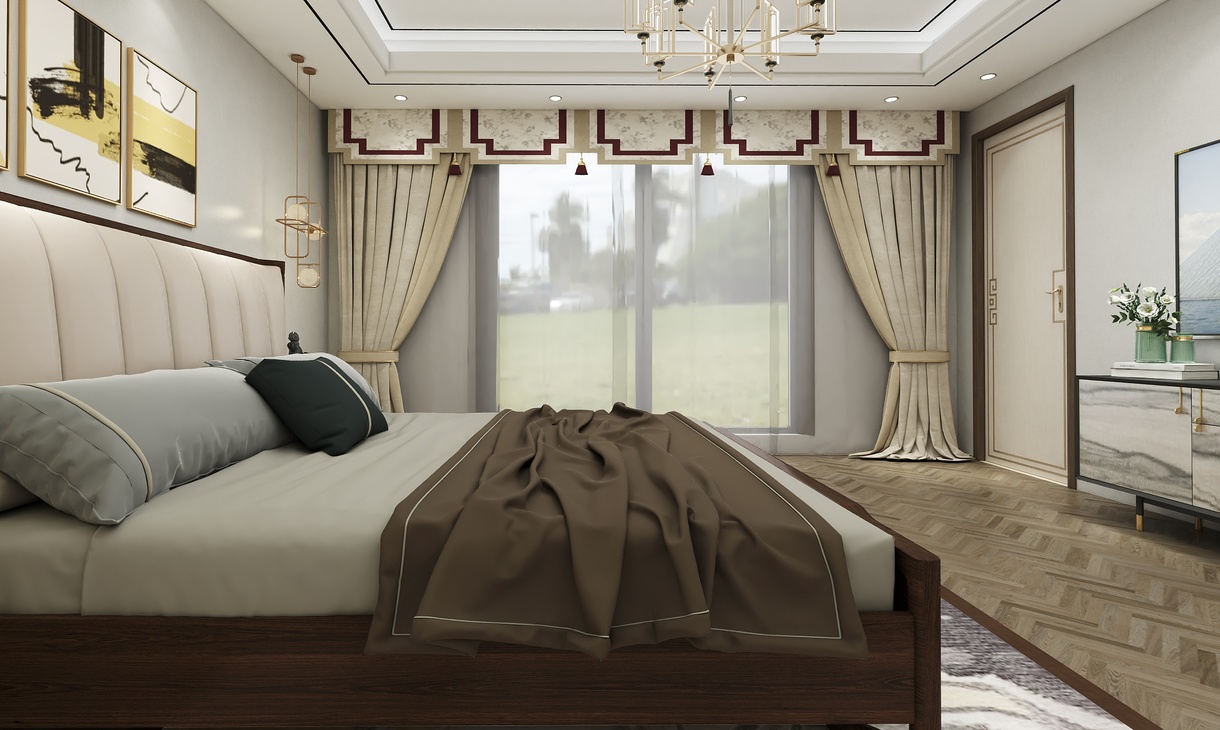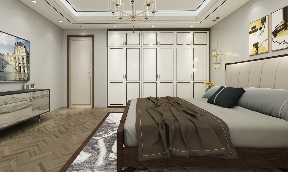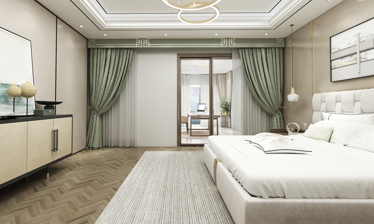 四層排屋設(shè)計,二層為主臥和父母房,每個房間都做成獨立套間,保證了各自的私密空間。風(fēng)格依舊是現(xiàn)代和中式的混搭