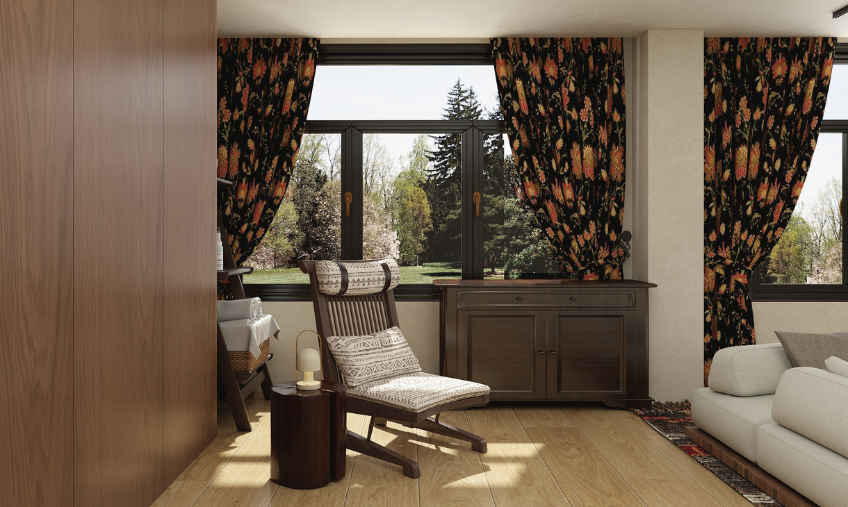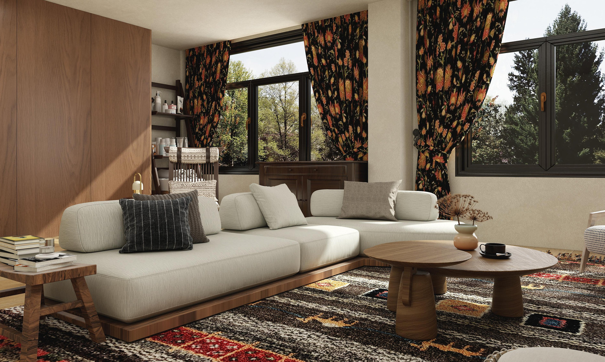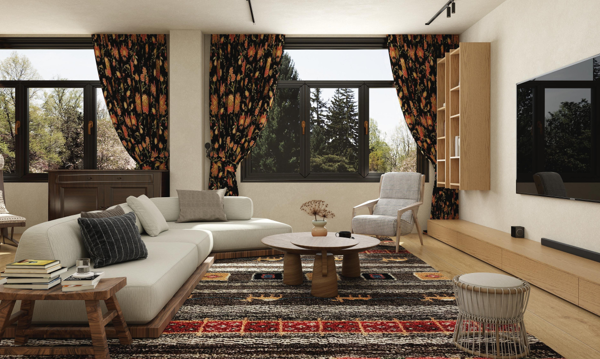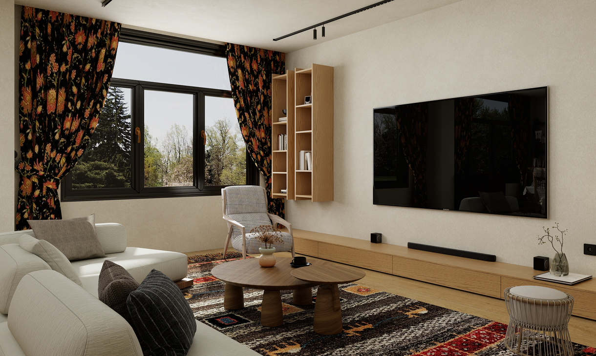 本設計旨在營造一個溫馨、舒適的田園風格客廳,帶給人們一種回歸自然的寧靜感。通過大量原木以及自然元素的運用,創(chuàng)造出一個放松身心的空間。