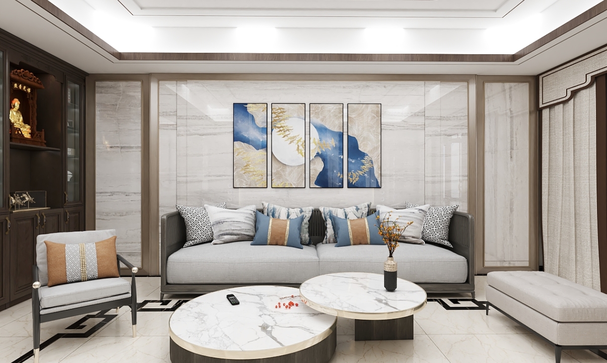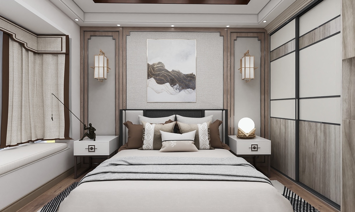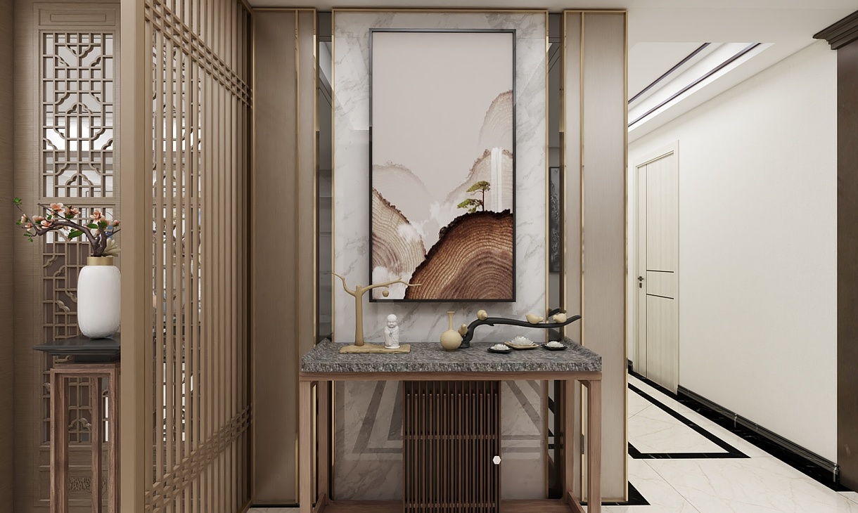 新中式設計風格,呈現(xiàn)出空間雅致、安靜的力量。以新中式的形式勾勒生活的美學質(zhì)地,簡凈的木色,人文情懷濃郁的水墨色,天然的紋理和材質(zhì)呈現(xiàn)出的質(zhì)感美,整體空間流瀉出沉靜淡然的氣息