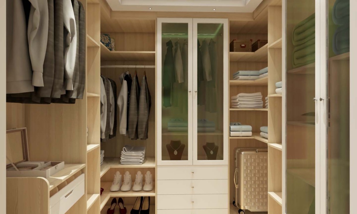 樸素簡(jiǎn)單的衣帽間,擁有著超強(qiáng)的收納衣服以及各式各樣的床上物品。