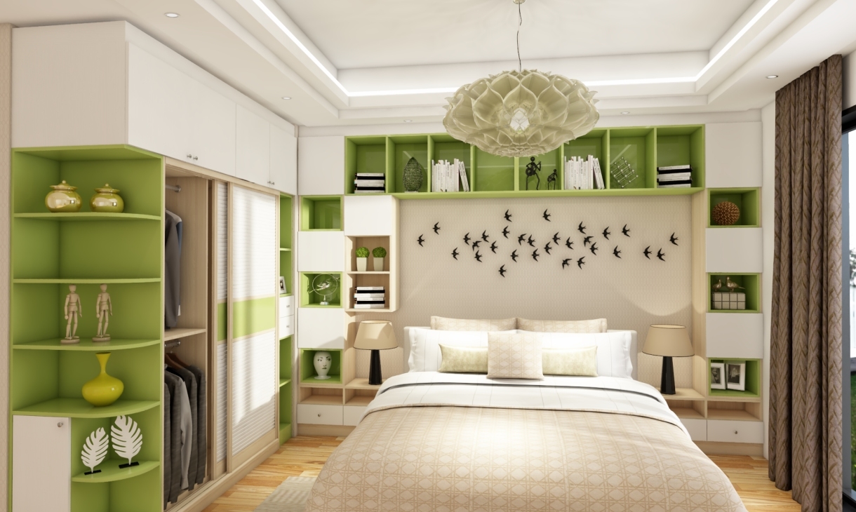 草綠色的氛圍加上一張舒適的床為您帶來(lái)一整夜的好睡眠。臥室的定制柜子為您打造更多儲(chǔ)物空間(讓您輕松找到物品)。有溫暖的燈光營(yíng)造氛圍,可以讓人酣然入夢(mèng)。