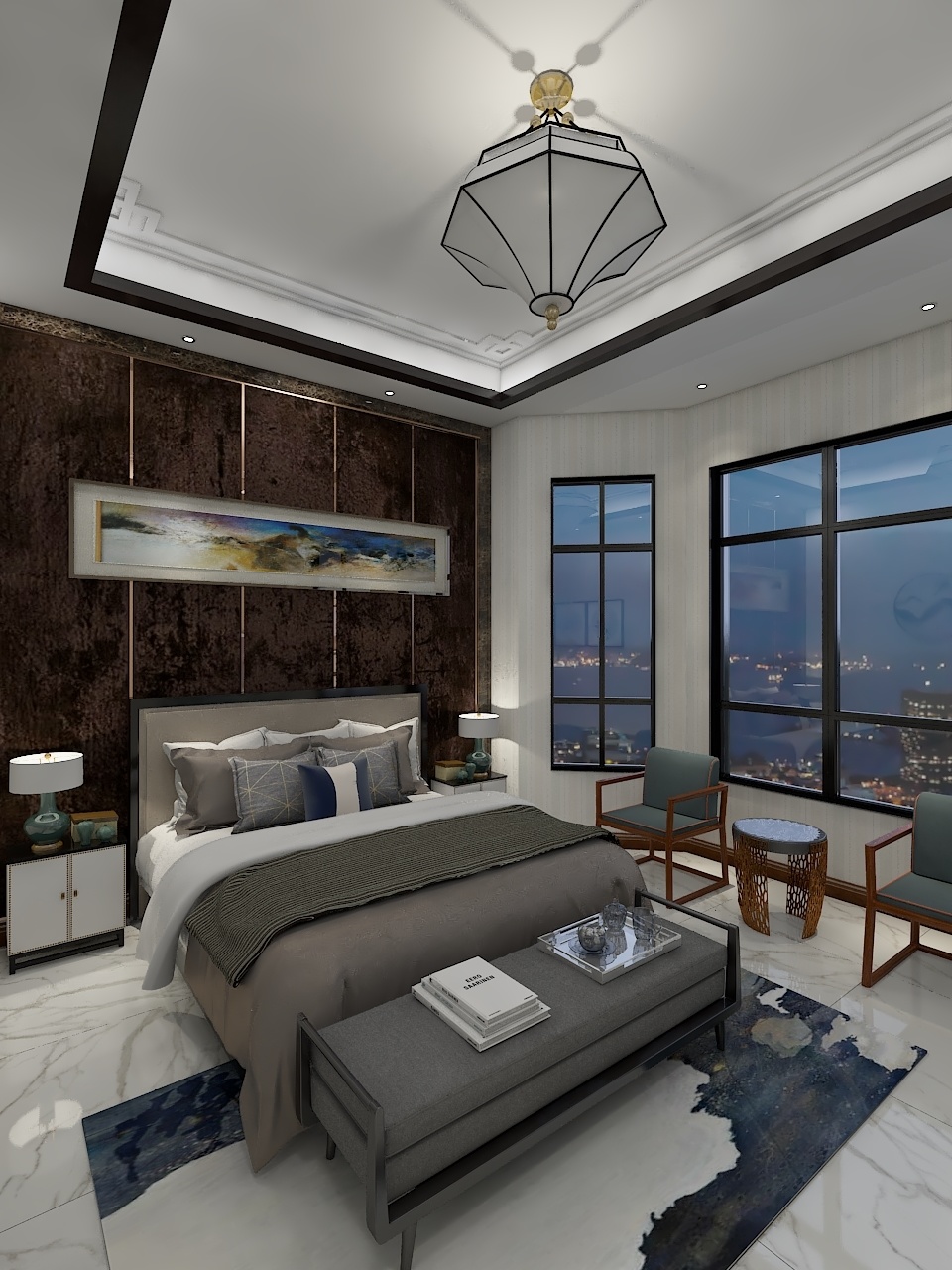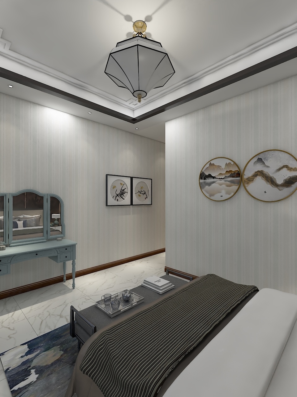 主臥在色彩方面秉承了傳統(tǒng)古典風(fēng)格的典雅和華貴,但與之不同的是加入了很多現(xiàn)代元素,呈現(xiàn)著時(shí)尚的特征。在配飾的選擇方面更為簡(jiǎn)潔,少了許多奢華的裝飾,更加流暢地表達(dá)出傳統(tǒng)文化中的精髓。為了給居室增添幾分暖意,飾以精巧的燈具和雅致的掛畫,使整個(gè)居室在濃濃古韻中滲透了幾許現(xiàn)代氣息。