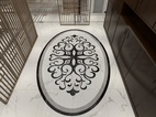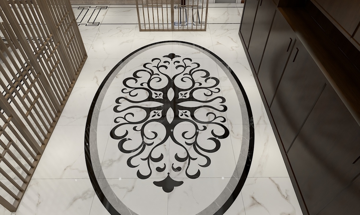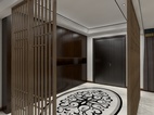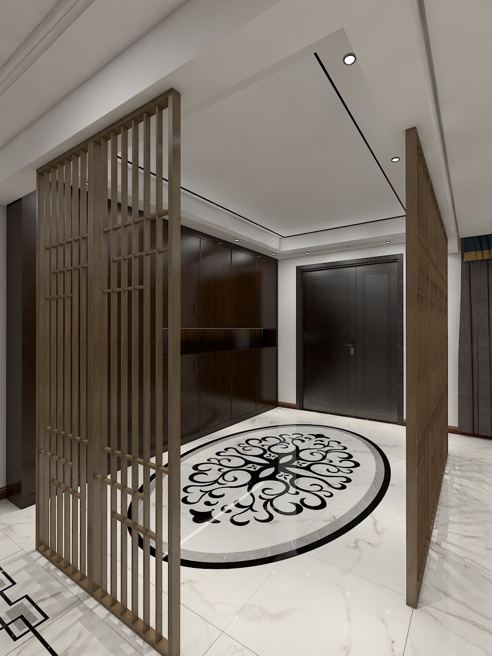 玄關(guān)地面橢圓形圖案,為新中式風(fēng)格裝修的空間營(yíng)造了一種團(tuán)團(tuán)圓圓,家庭和睦的氛圍。同時(shí)兩側(cè)木質(zhì)柵格屏風(fēng)采用簡(jiǎn)單的線條樣式,配上中式風(fēng)格裝修中傳統(tǒng)的玄關(guān)柜,完美的體現(xiàn)了新中式風(fēng)格裝修的莊重和現(xiàn)代的簡(jiǎn)約。