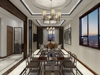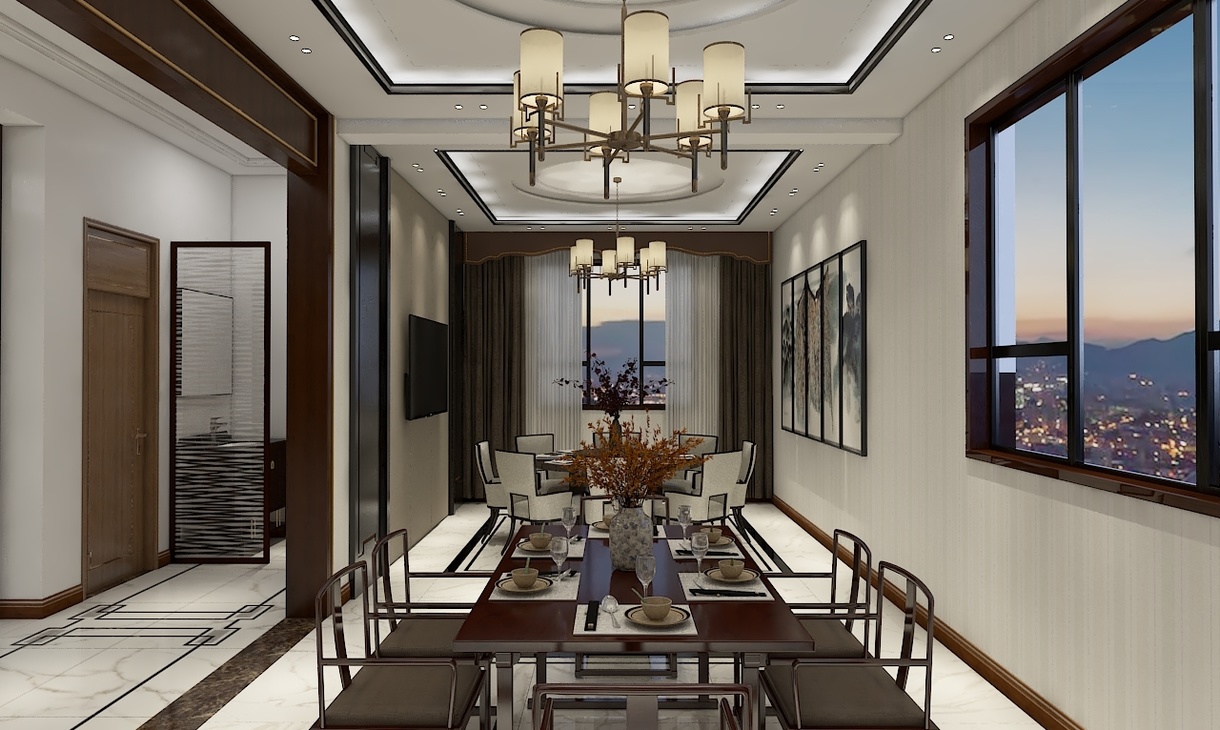 餐廳分為兩部分,地面波打線與天花板的造型相對(duì)應(yīng),體現(xiàn)了中式風(fēng)格裝修的對(duì)稱特點(diǎn)。亮黃色的燈具打破了空間的壓抑感,讓中式風(fēng)格裝修的餐廳多了一份生氣和精彩。