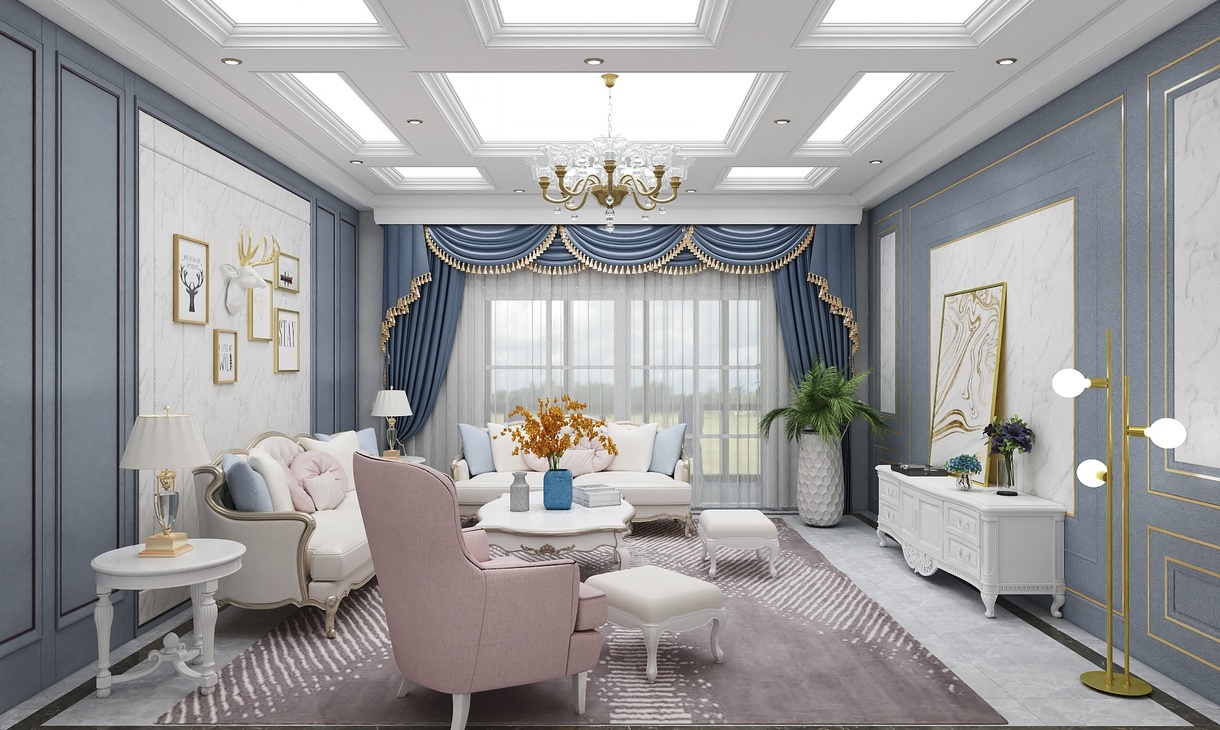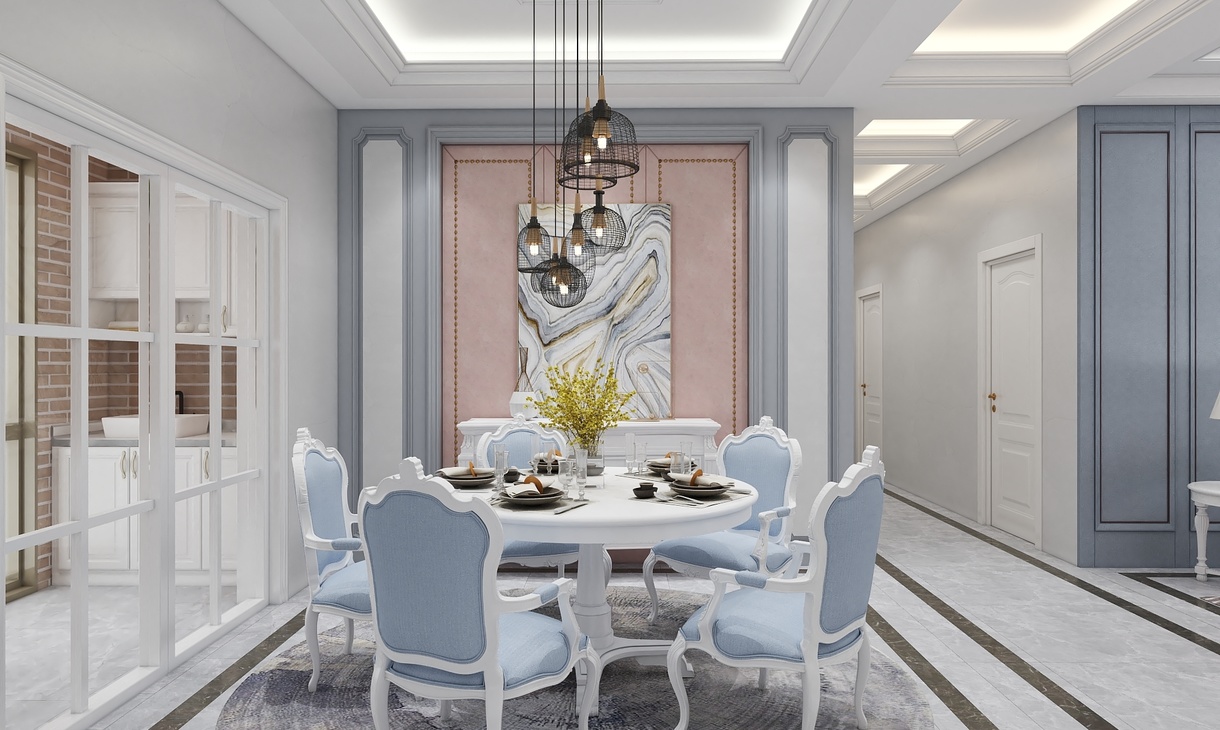 粉藍色調(diào)甜蜜優(yōu)雅,作為背景奠定空間雅致基調(diào),白色提亮色調(diào),與金屬搭配高級亮眼,與屋主的喜好相貼合。