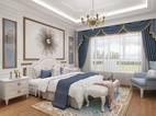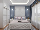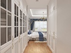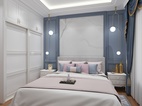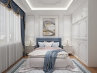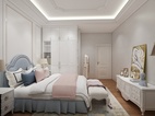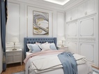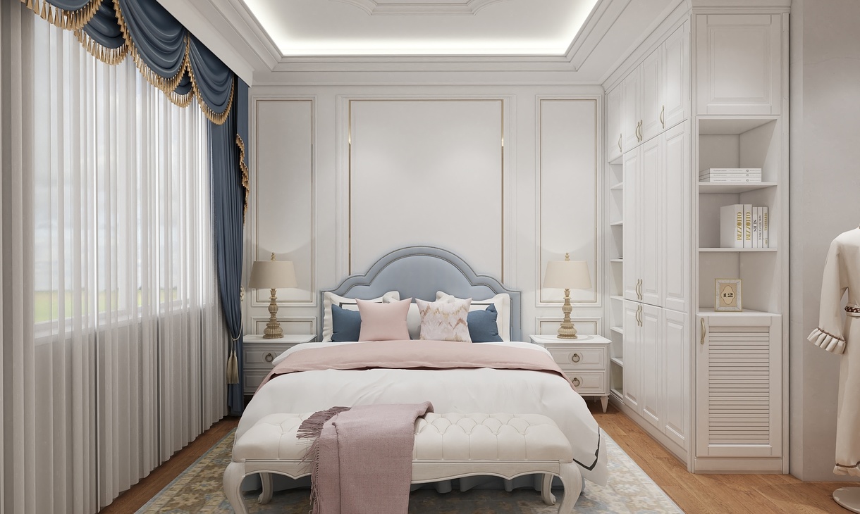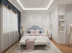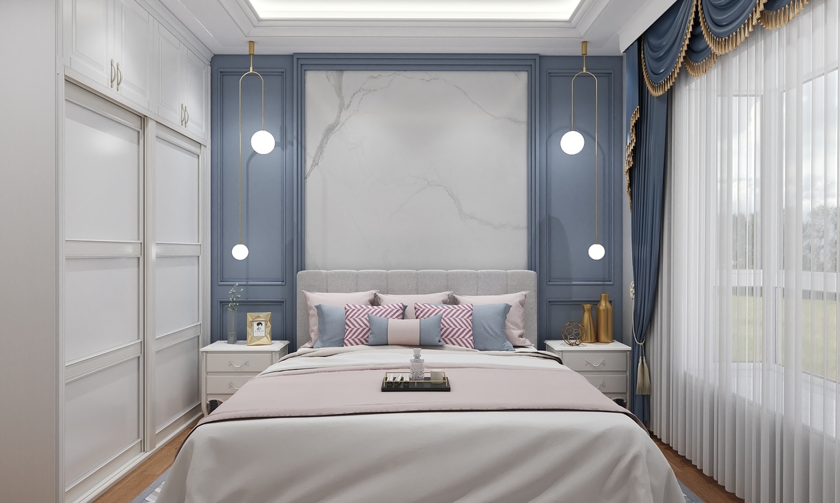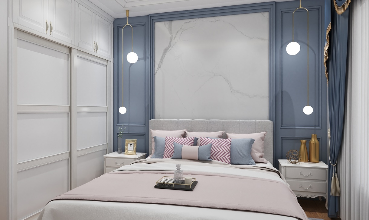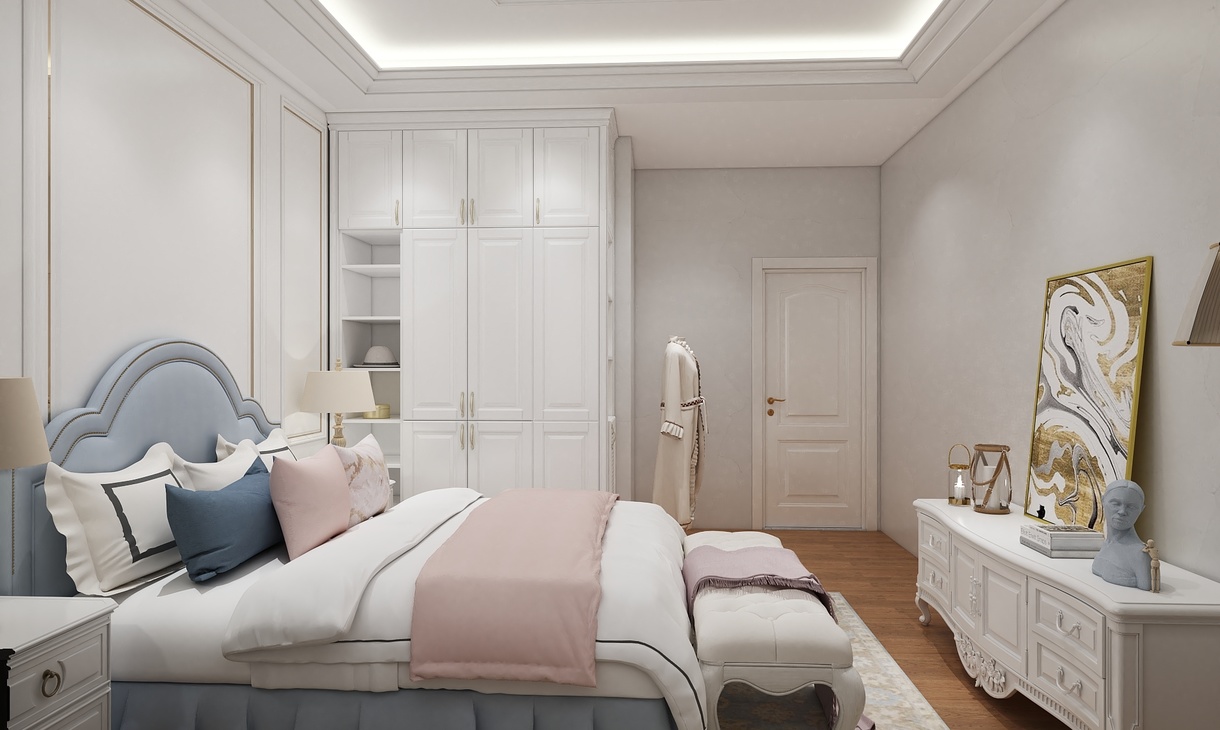 白色的柜體造型極盡優(yōu)雅,藍粉色的搭配溫馨舒適、帶金屬邊的背景墻展現(xiàn)出來臥室的細節(jié)與品位。