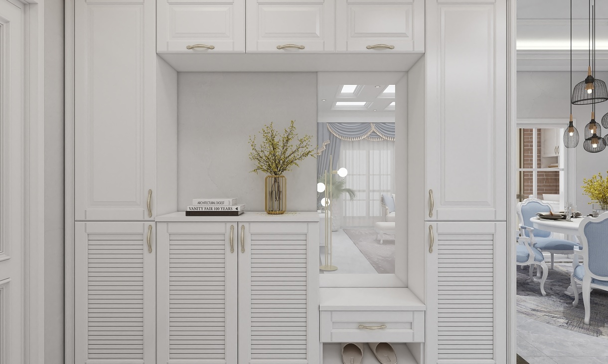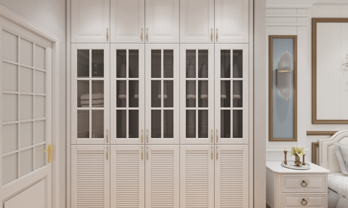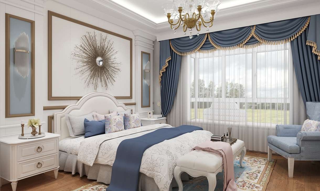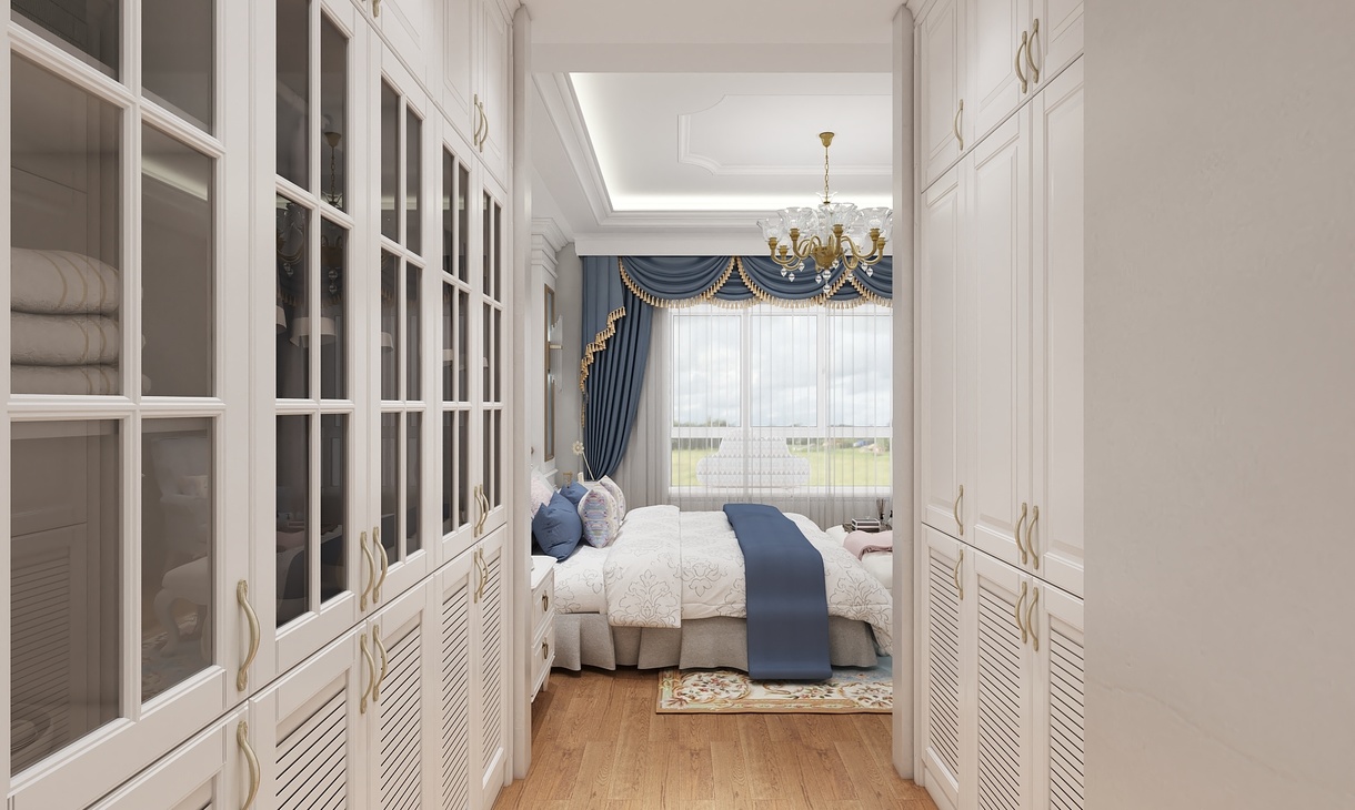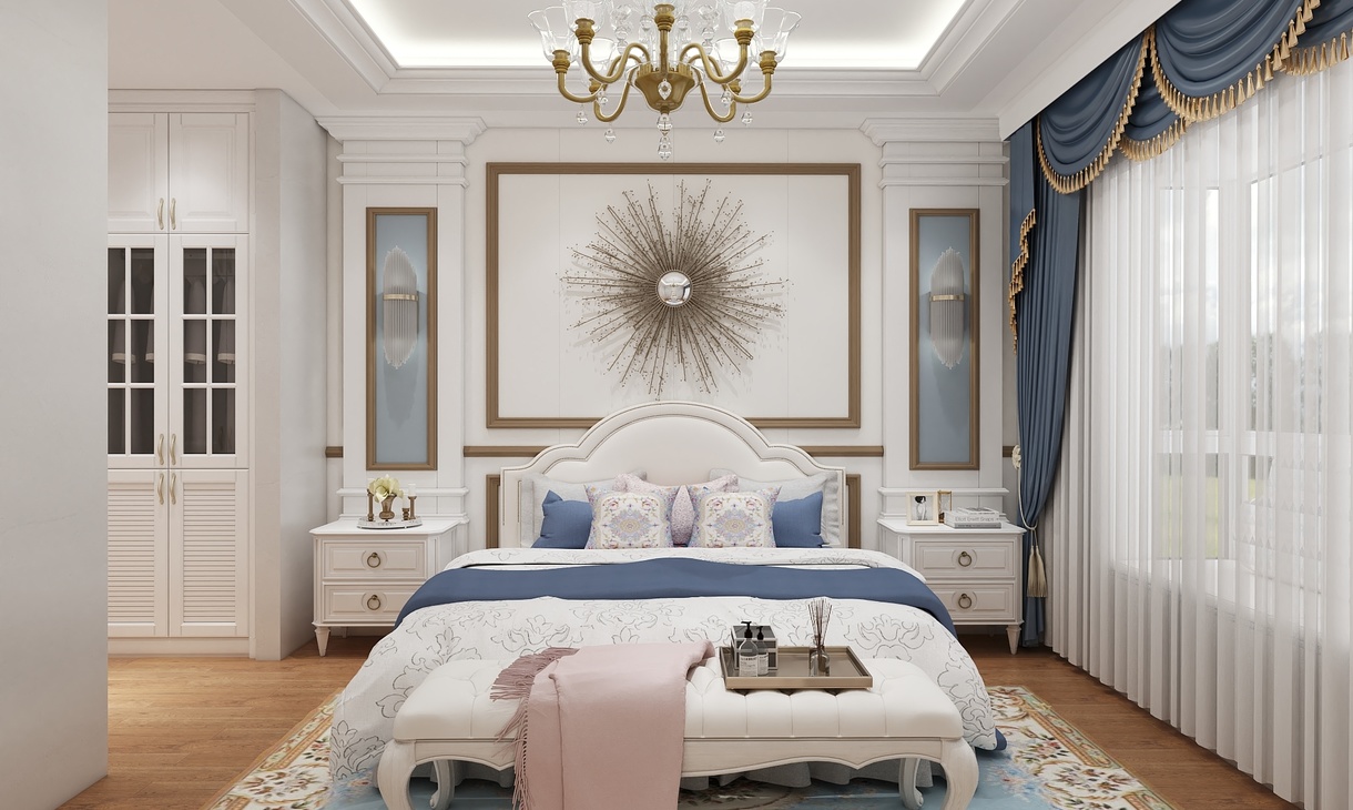 白色的柜體造型極盡優(yōu)雅,藍粉色的搭配溫馨舒適、帶金屬邊的背景墻展現(xiàn)出來臥室的細節(jié)與品位。