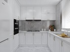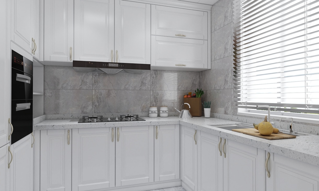 廚房設(shè)計師選擇白色櫥柜搭配石紋墻地磚,打造通透潔凈的空間,金屬色櫥柜把手也為其帶來精致感。