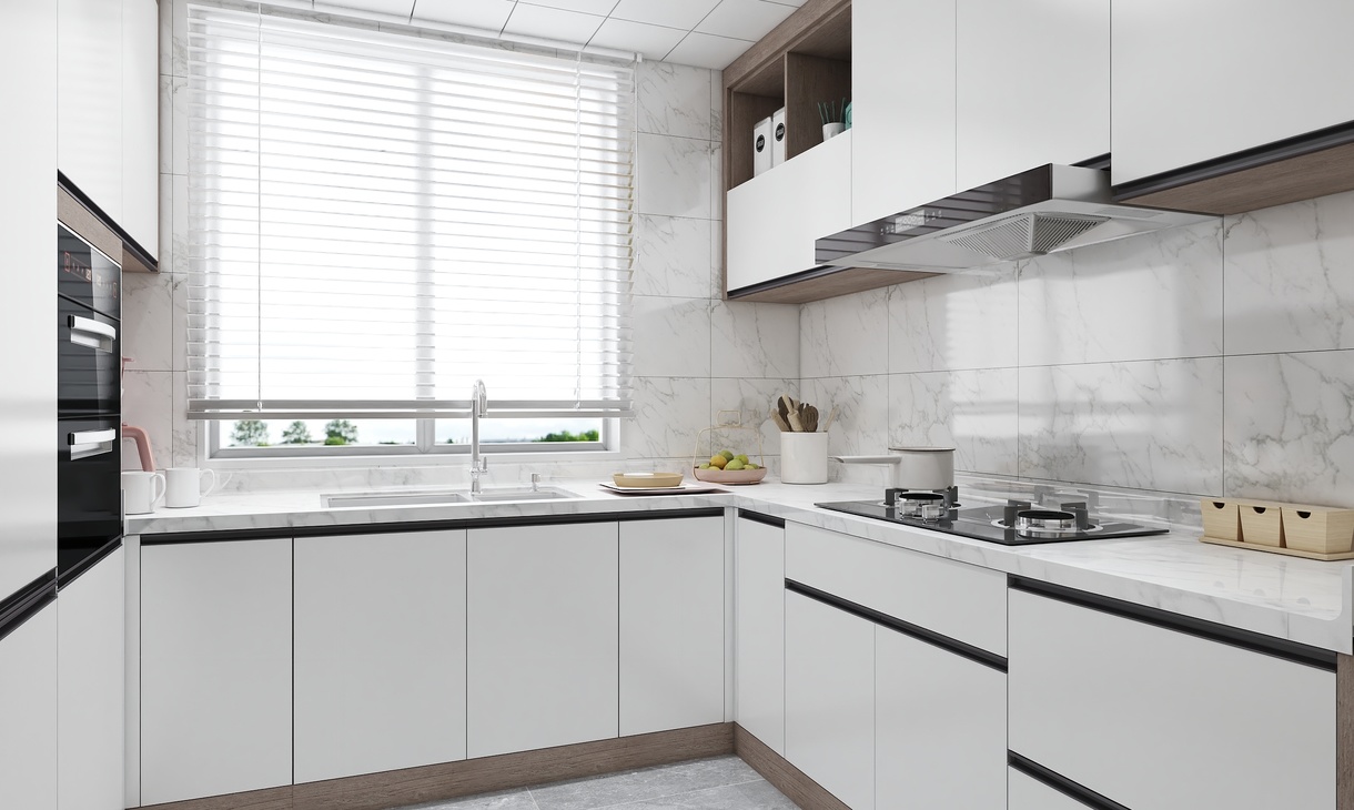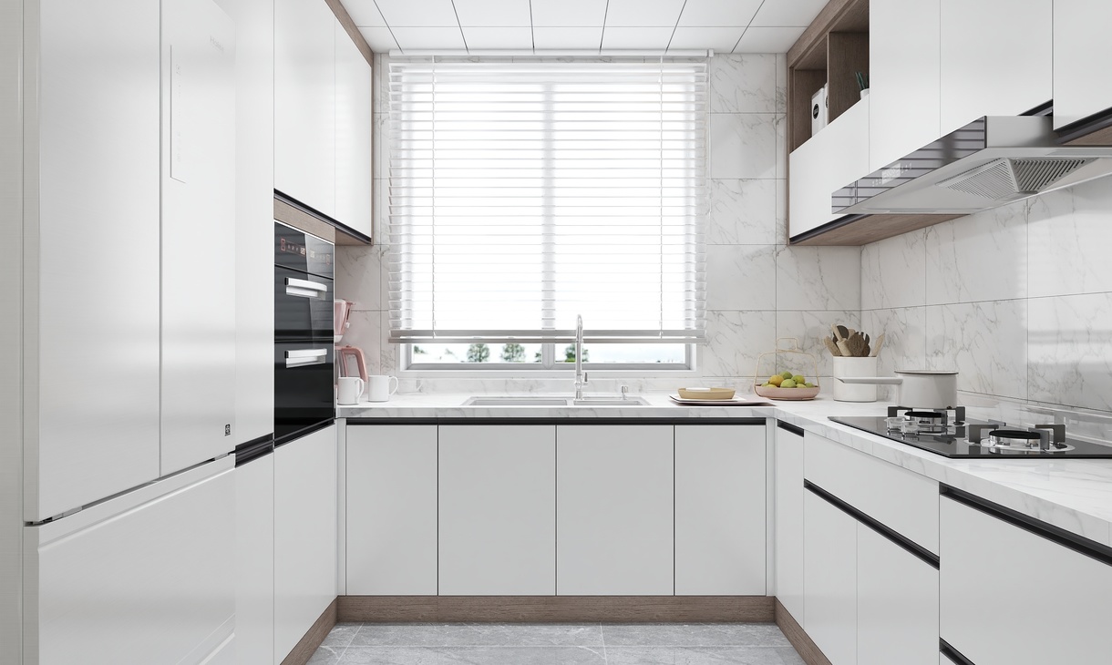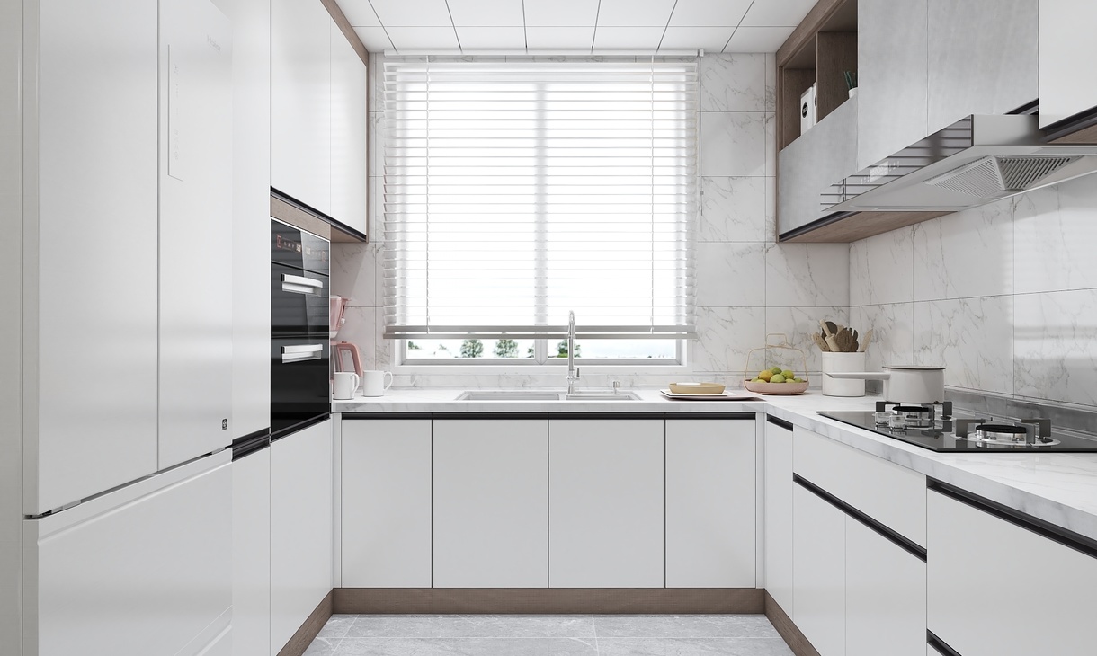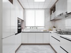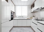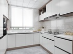 櫥柜整體以白色主搭配木紋的柜體材質(zhì)深淺層次錯落有致,透過玻璃推拉門與餐廳空間形成鮮明對比,使兩個空間在整體上合二為一。