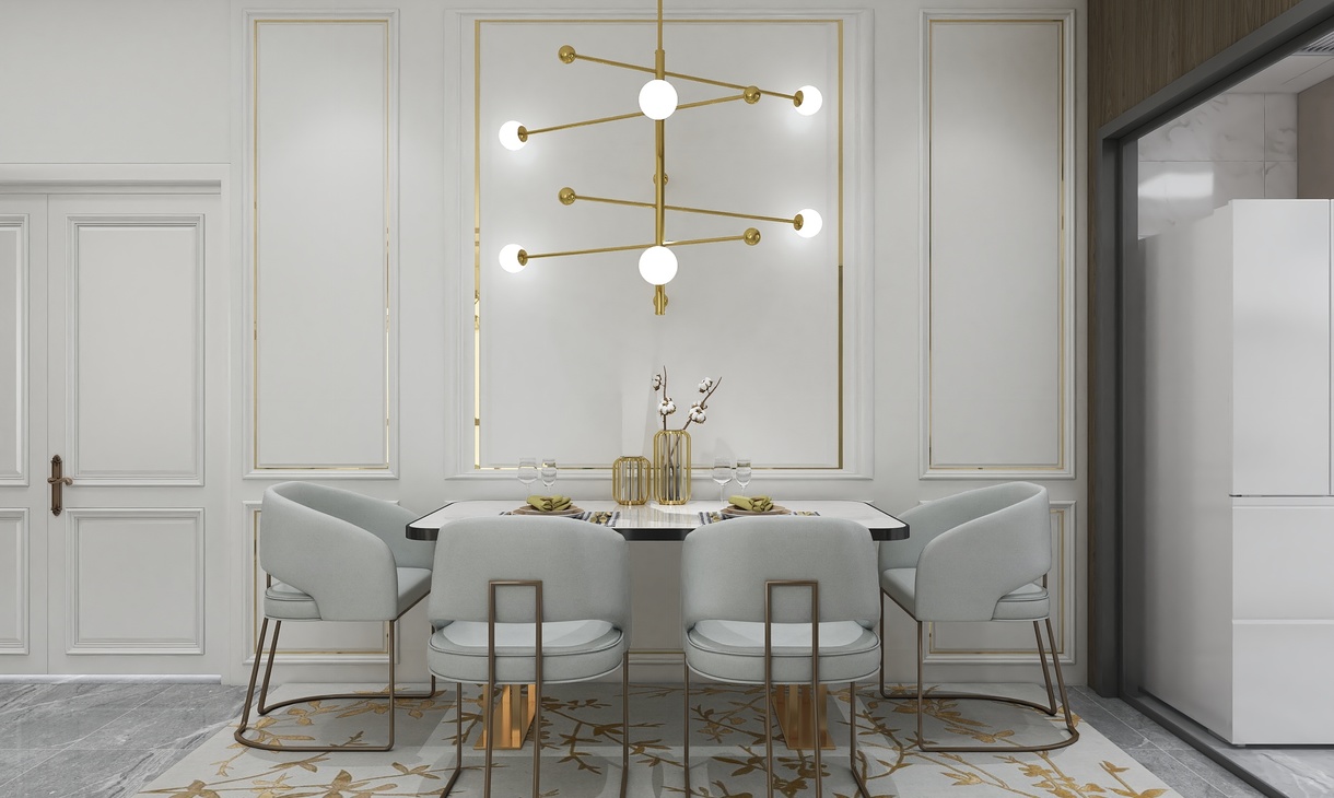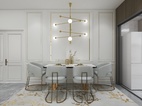 客廳整體空間為淺色系,線條簡潔流暢,奠定了空間優(yōu)雅的基調(diào)。單人椅采用高級布藝材料,巧妙搭配自然質(zhì)感的木材以及金屬元素,給予色彩最大的禮贊。餐廳延續(xù)了客廳的色彩基調(diào),金屬材質(zhì)與大理石組合時尚、奢華。