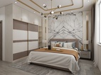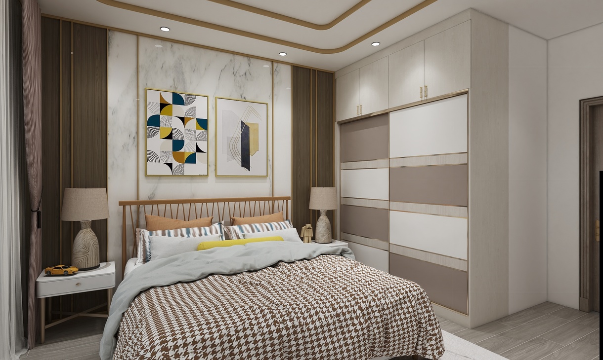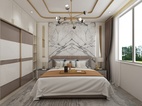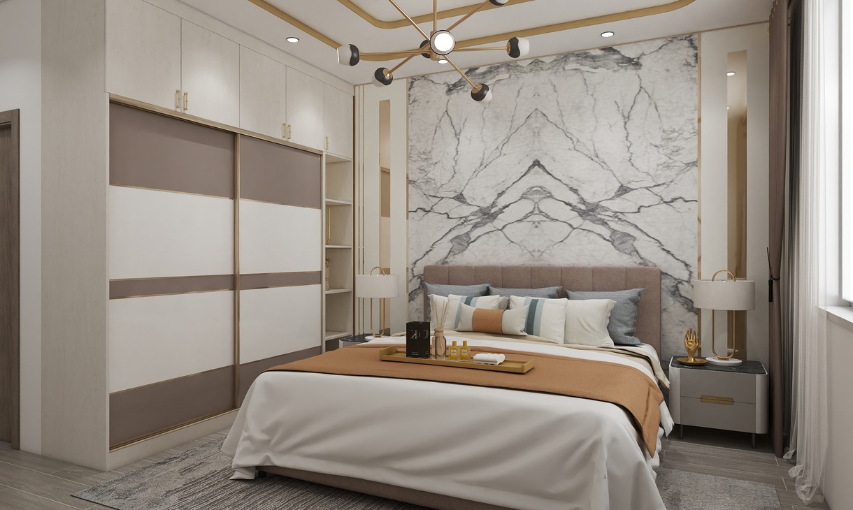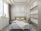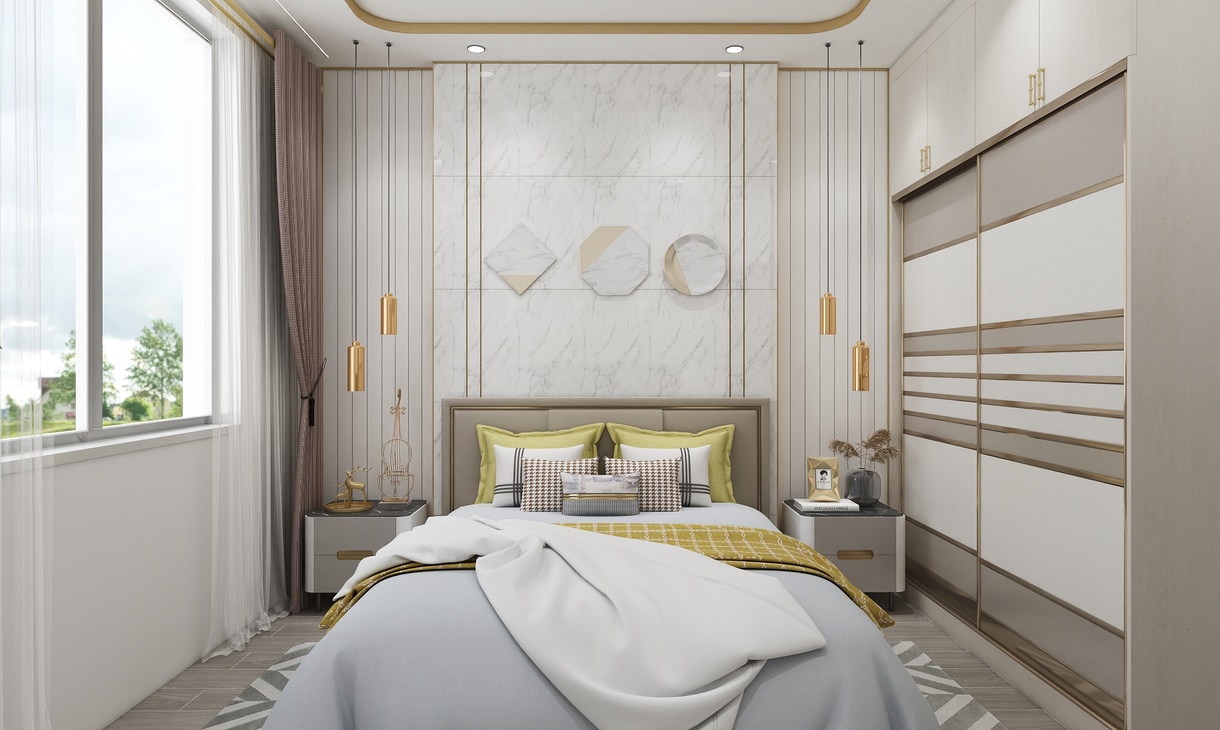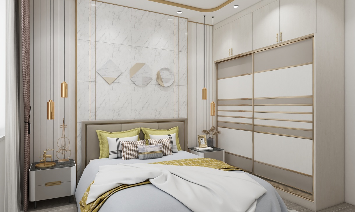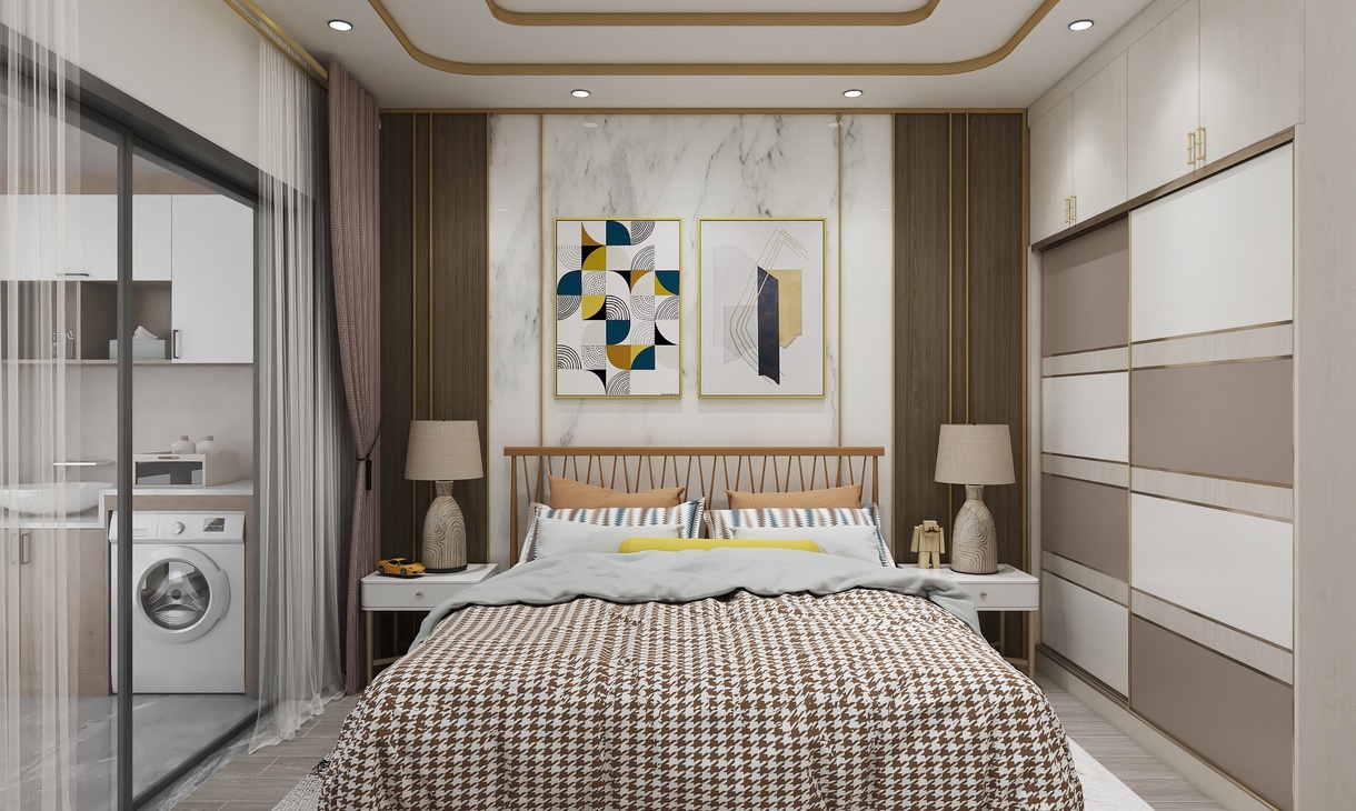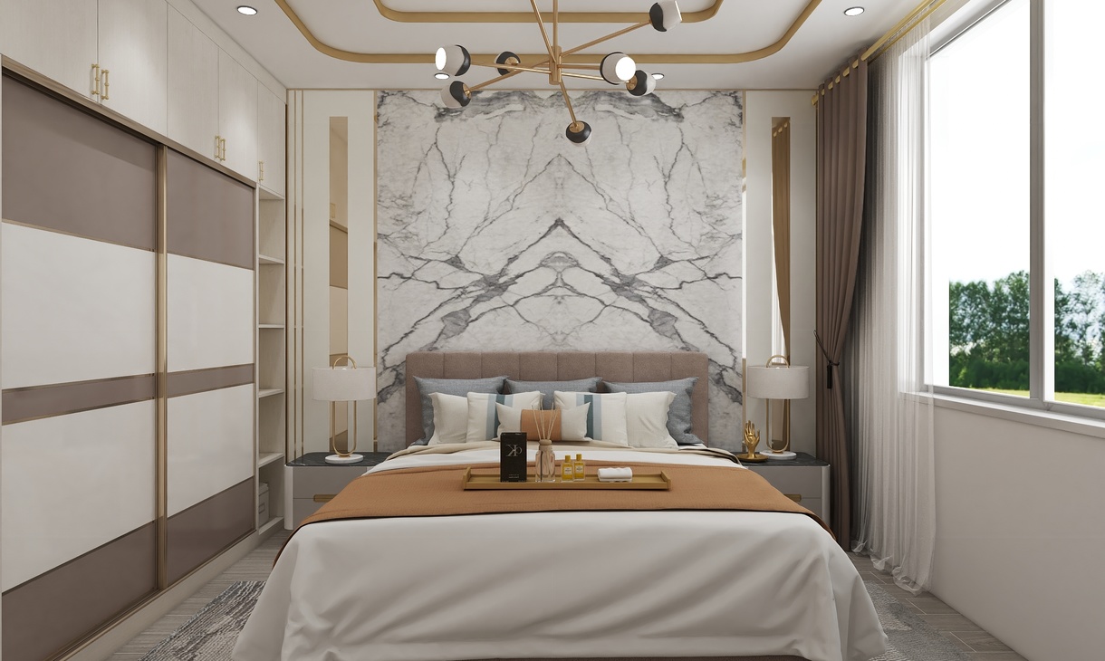 以白色、金屬和木色作為空間的主色調(diào),簡約的線條在比例的把控下穿梭于背景和床頭造型之間,形成迷人的美感。