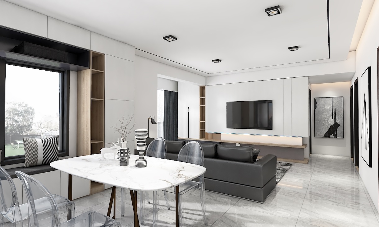 圍繞現(xiàn)代極簡為主題,在空間上,盡量減少不必要的裝飾.顏色與元素。 大道至簡,在久經(jīng)視覺長河的考驗(yàn)中,能久賞不厭。富有設(shè)計(jì)極簡感的電視墻,打通客廳陽臺(tái),貫穿整個(gè)空間,使其成為不可缺少的一個(gè)視覺。在兼顧美觀同時(shí),還富有強(qiáng)大的收納功能。