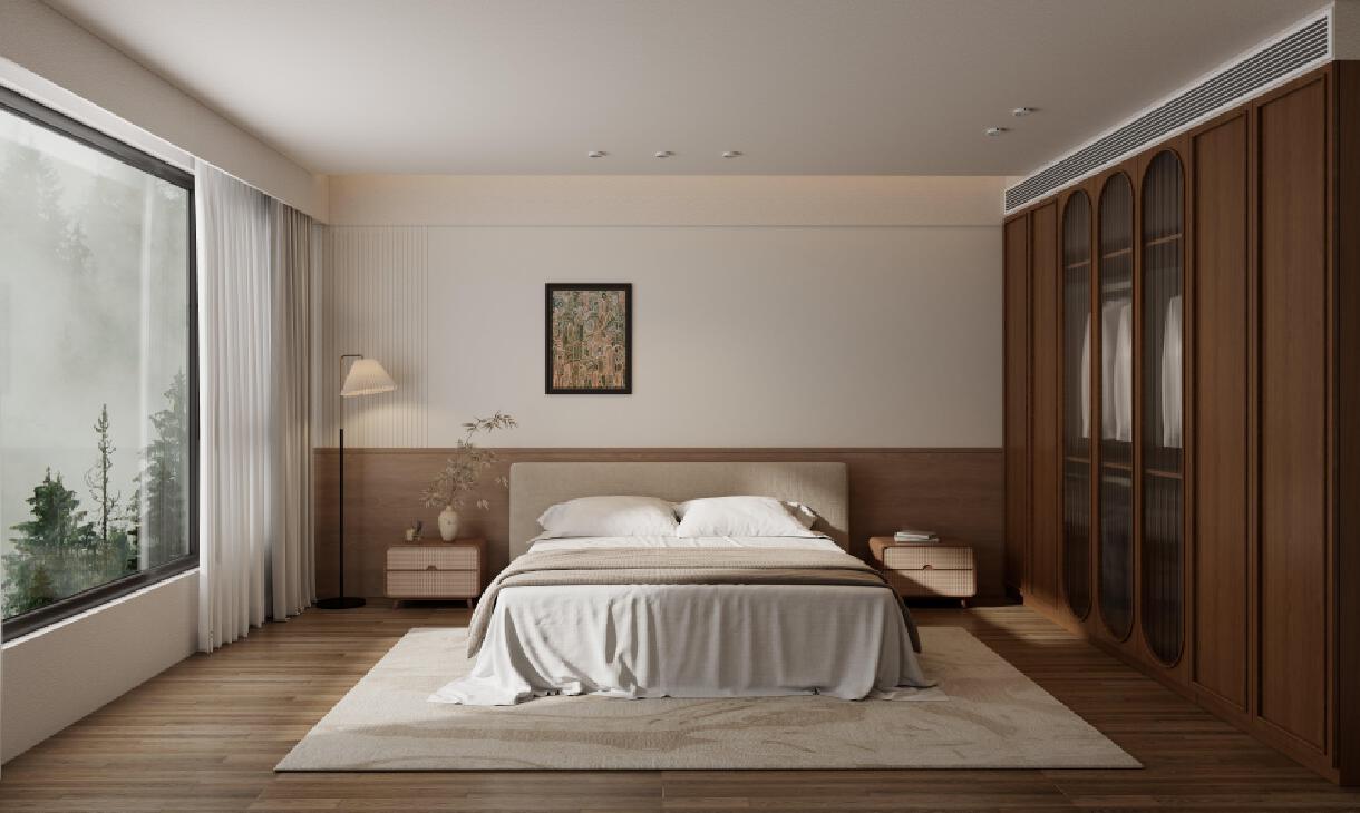 該臥室設(shè)計采用了中古風(fēng)格,以大地色調(diào)為主,營造出溫馨舒適的氛圍。床頭墻的上下分色處理以及衣柜的圓拱造型,增加了空間的層次感和趣味性。大面落地窗引入充足采光,使房間顯得寬敞明亮。床頭柜和立燈的搭配既實用又美觀,而床頭畫作則為空間增添了藝術(shù)氣息。整體設(shè)計簡潔而不失精致,展現(xiàn)出一種低調(diào)奢華的質(zhì)感。