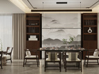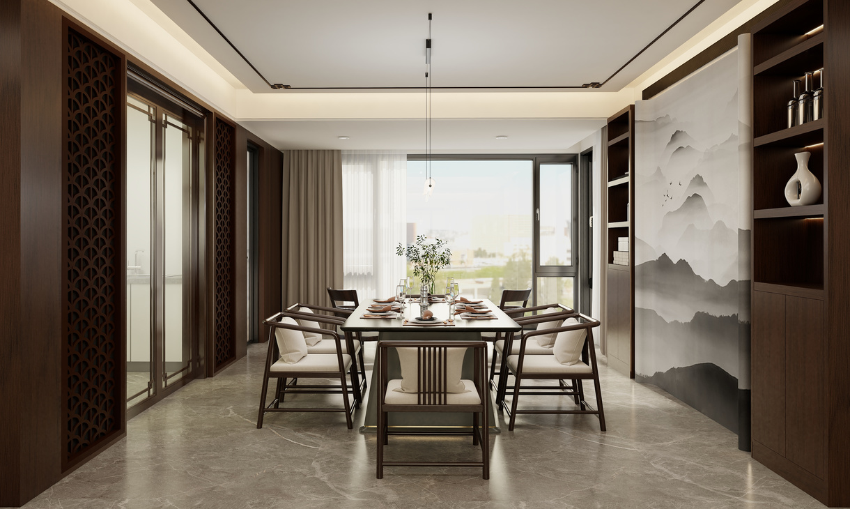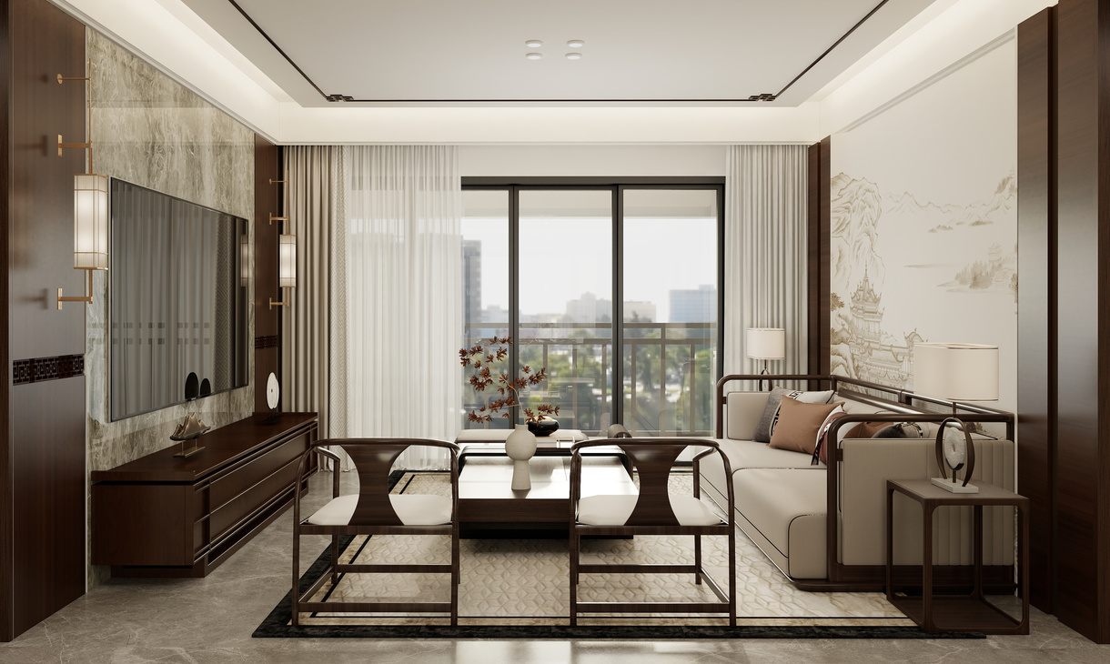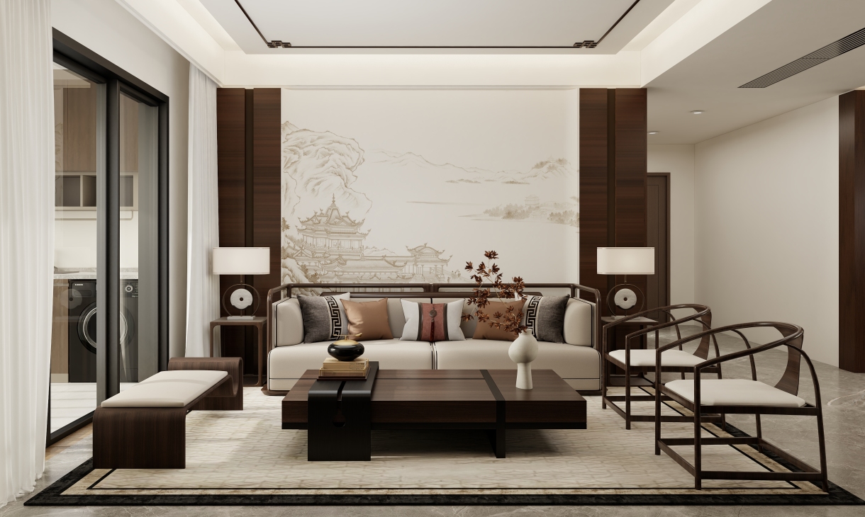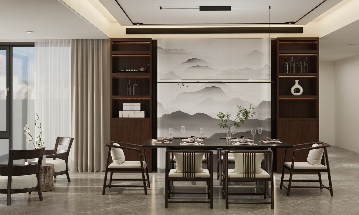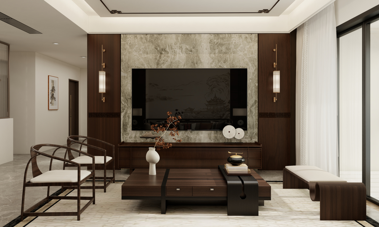 方案將傳統(tǒng)中式與現(xiàn)代審美理念相結(jié)合??臻g靈感來源于山水畫,注重材質(zhì)的質(zhì)感和紋理,以胡桃木實木材質(zhì)為主,整體營造出既古樸典雅又不失現(xiàn)代感氛圍。
