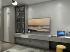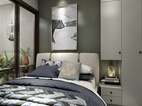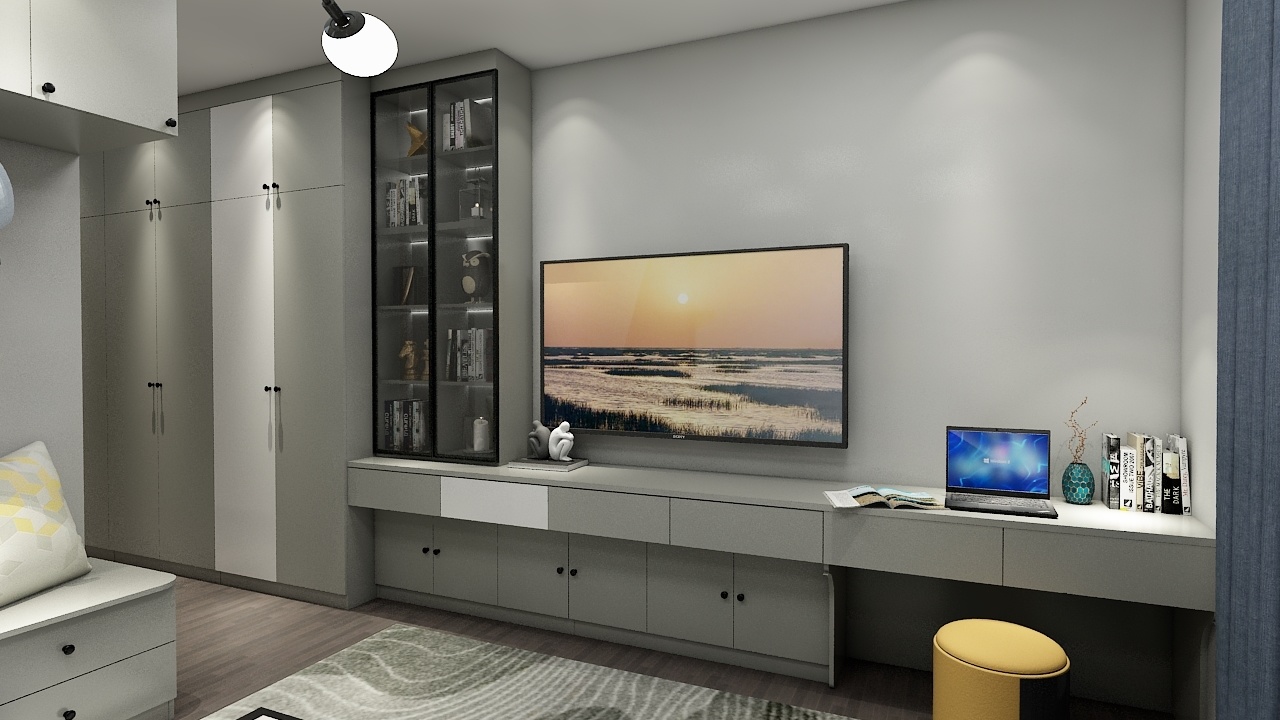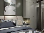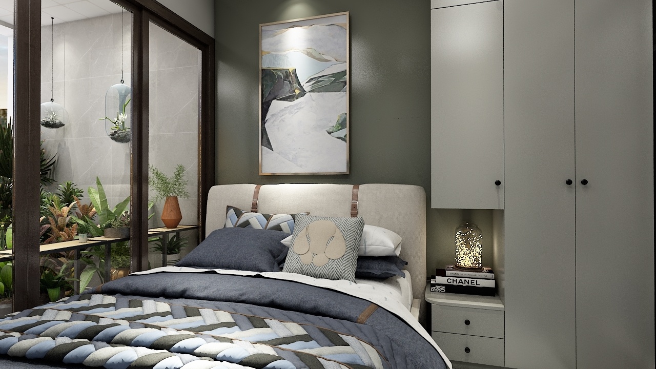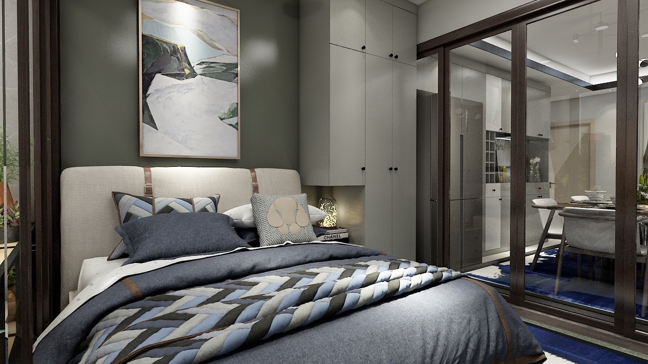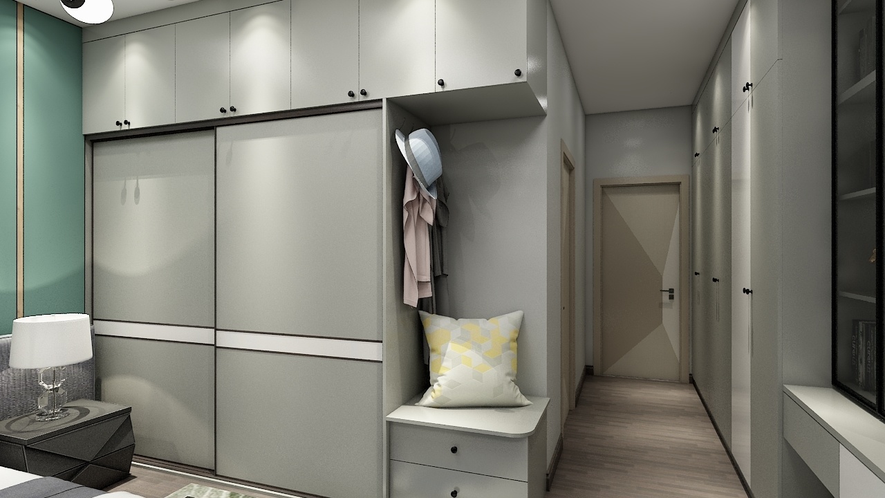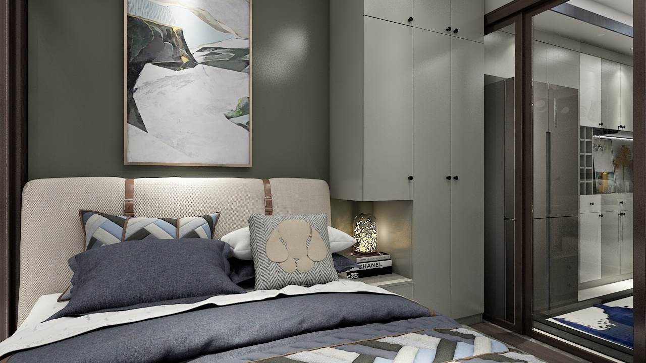 主臥的合理設計把空間的柜子都設計出簡潔,加上綠色的背景墻成為點綴,儲物空間和工作空間都在一個空間里完成。