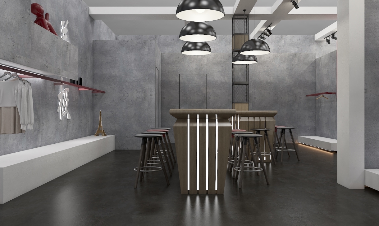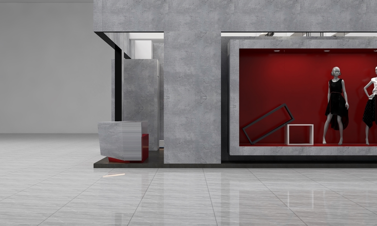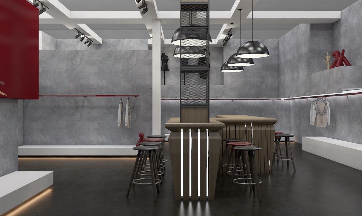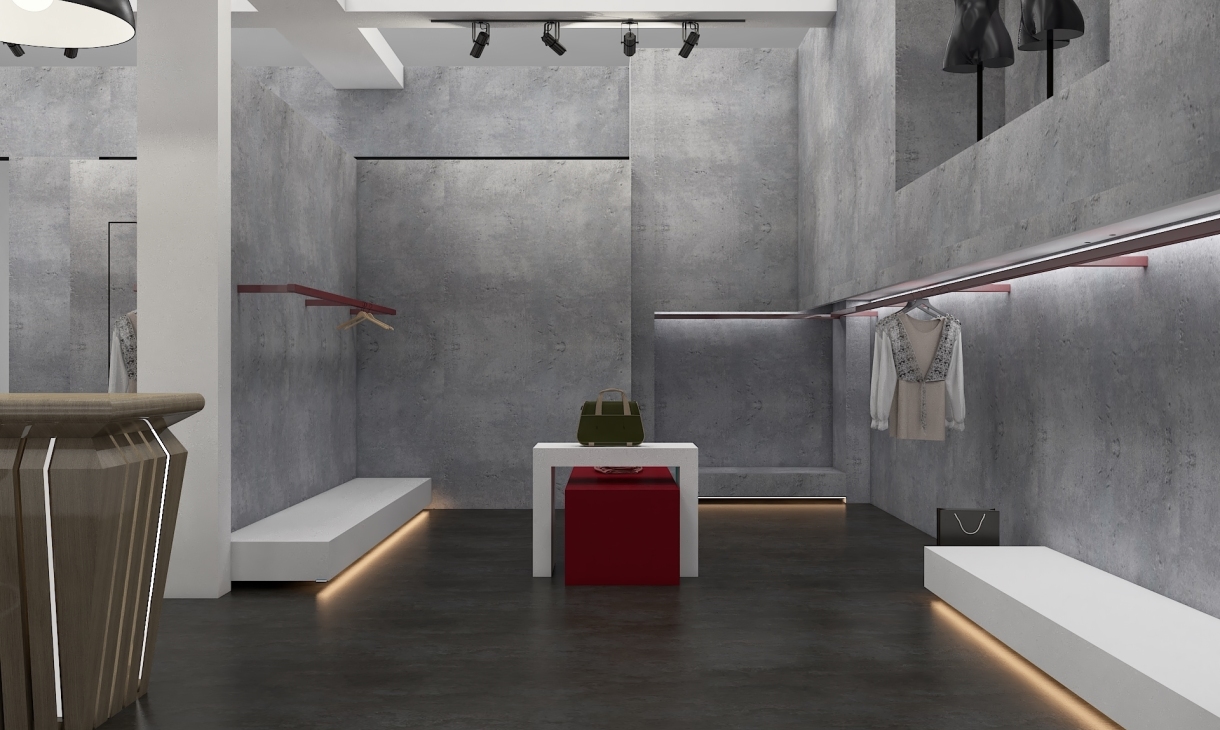水泥灰搭配緋紅,效果還蠻高級(jí)的服裝展廳