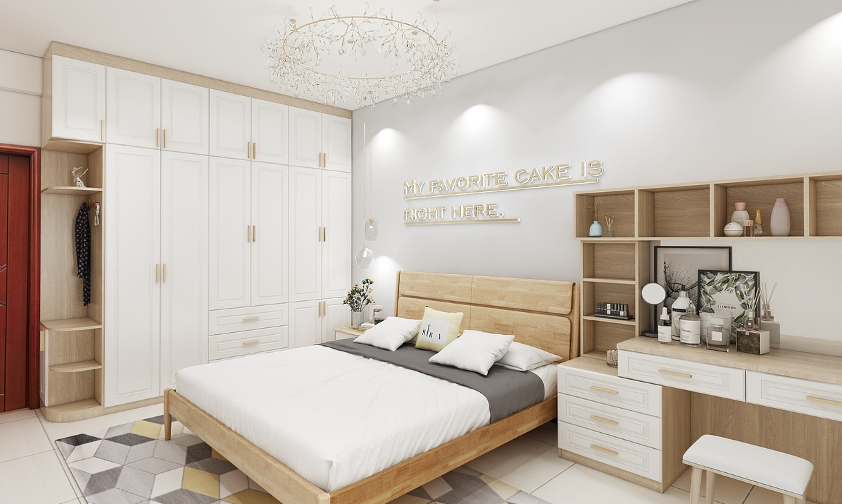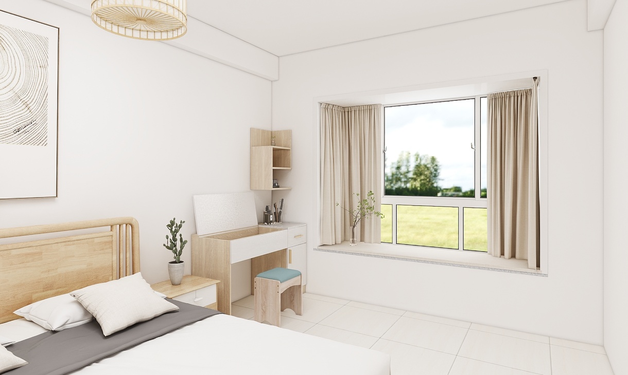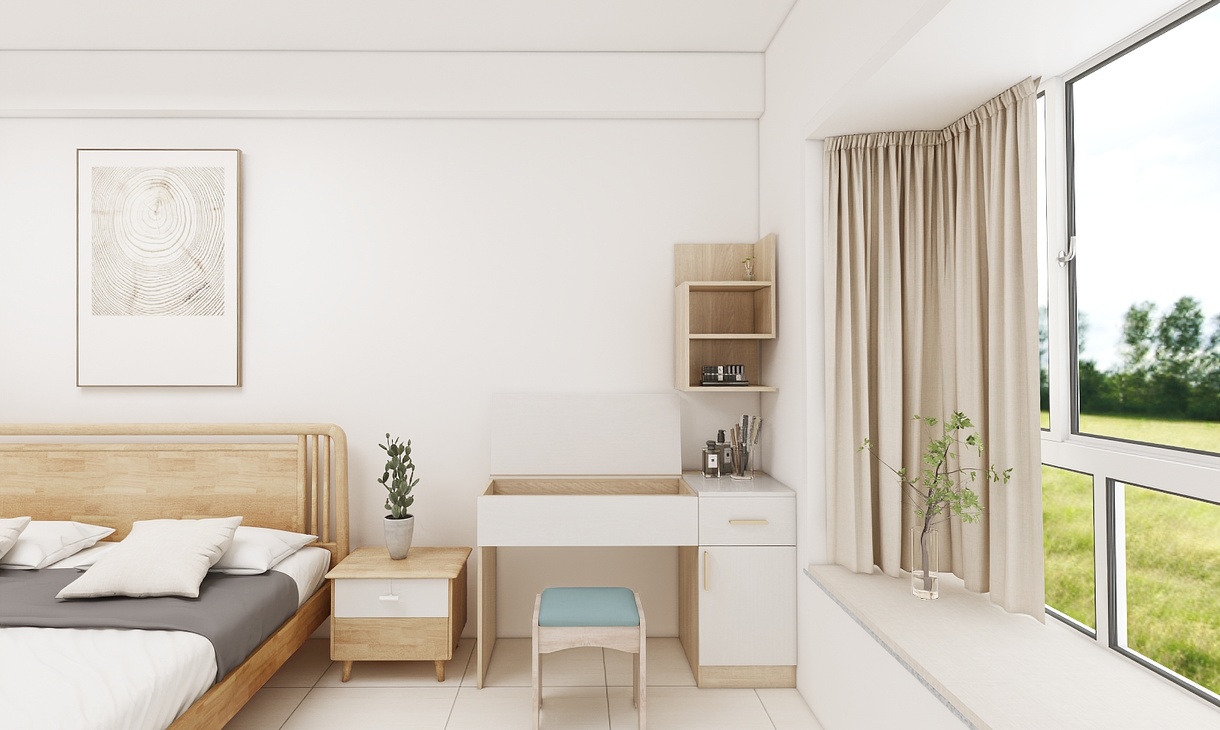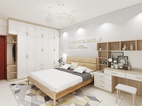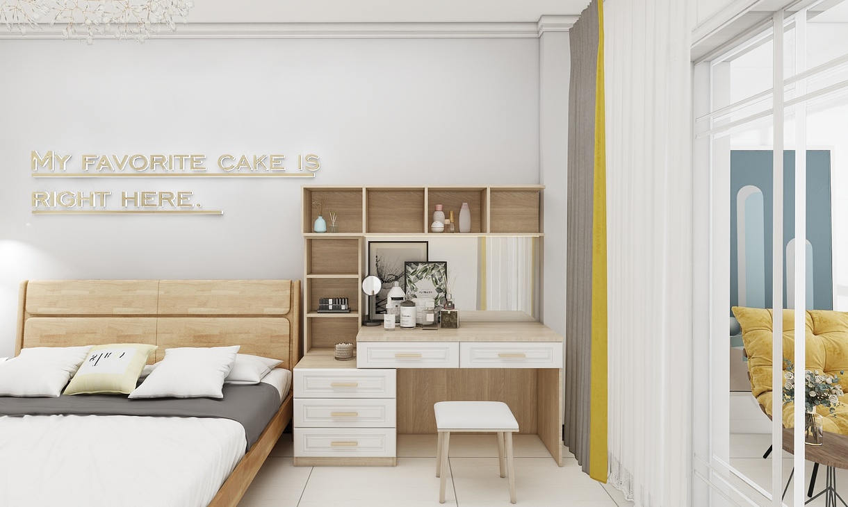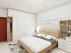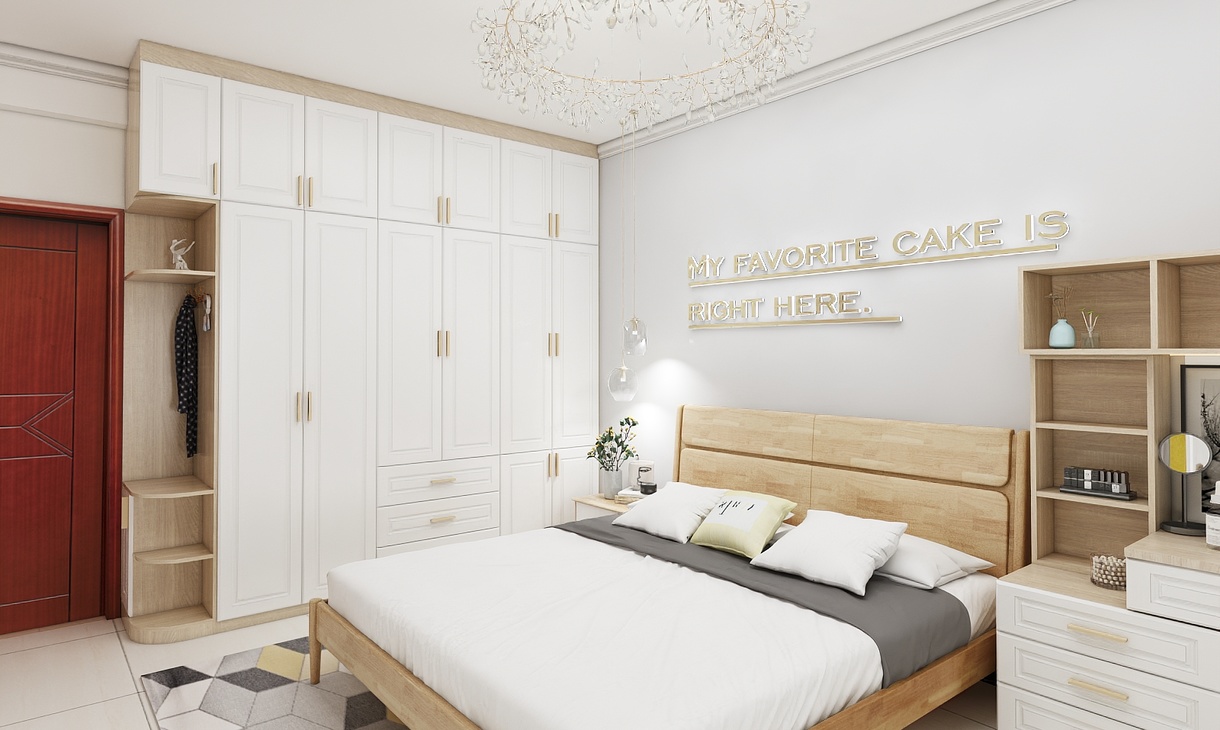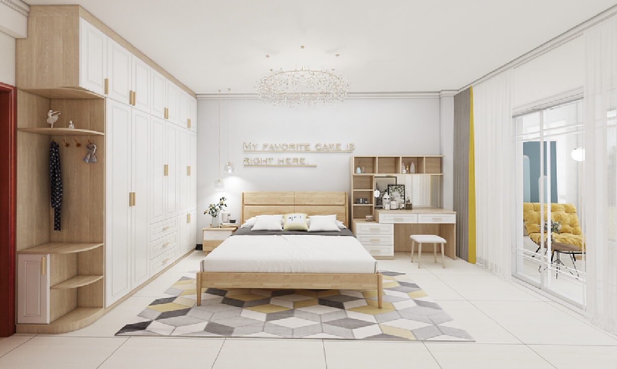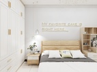 主臥室為年輕的小夫妻居住,需要滿足愛美的女士梳妝的需求,平時衣服也比較多,在空間大小允許的情況下,盡量多的儲物空間。