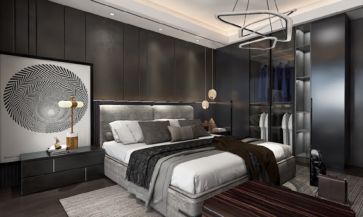 本方案以意式輕奢展開,輕奢的皮革元素與柵格狀的現(xiàn)代元素交織在一起,呈現(xiàn)出一種,高貴而沉穩(wěn)的氣氛,白色背景的現(xiàn)代畫,猶如一輪明月,在沉悶的空間像似涌現(xiàn)出一絲光明??臻g的層次感也隨之而來。
