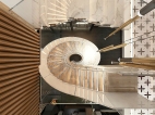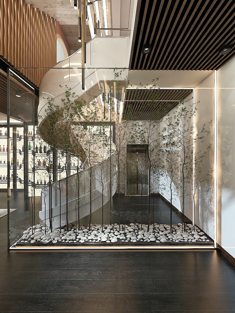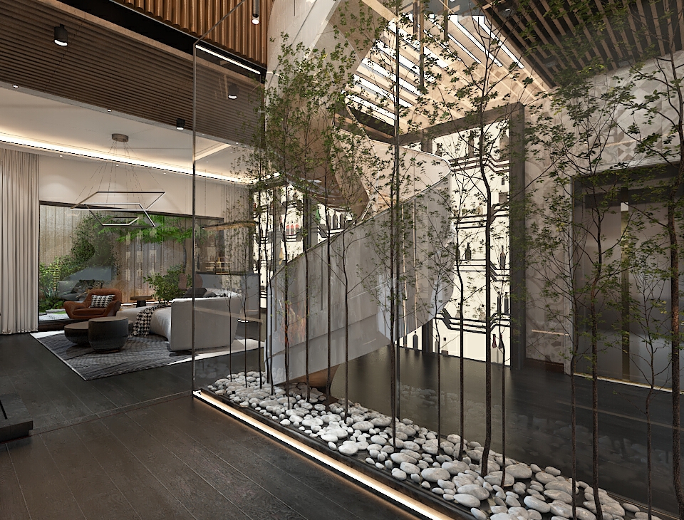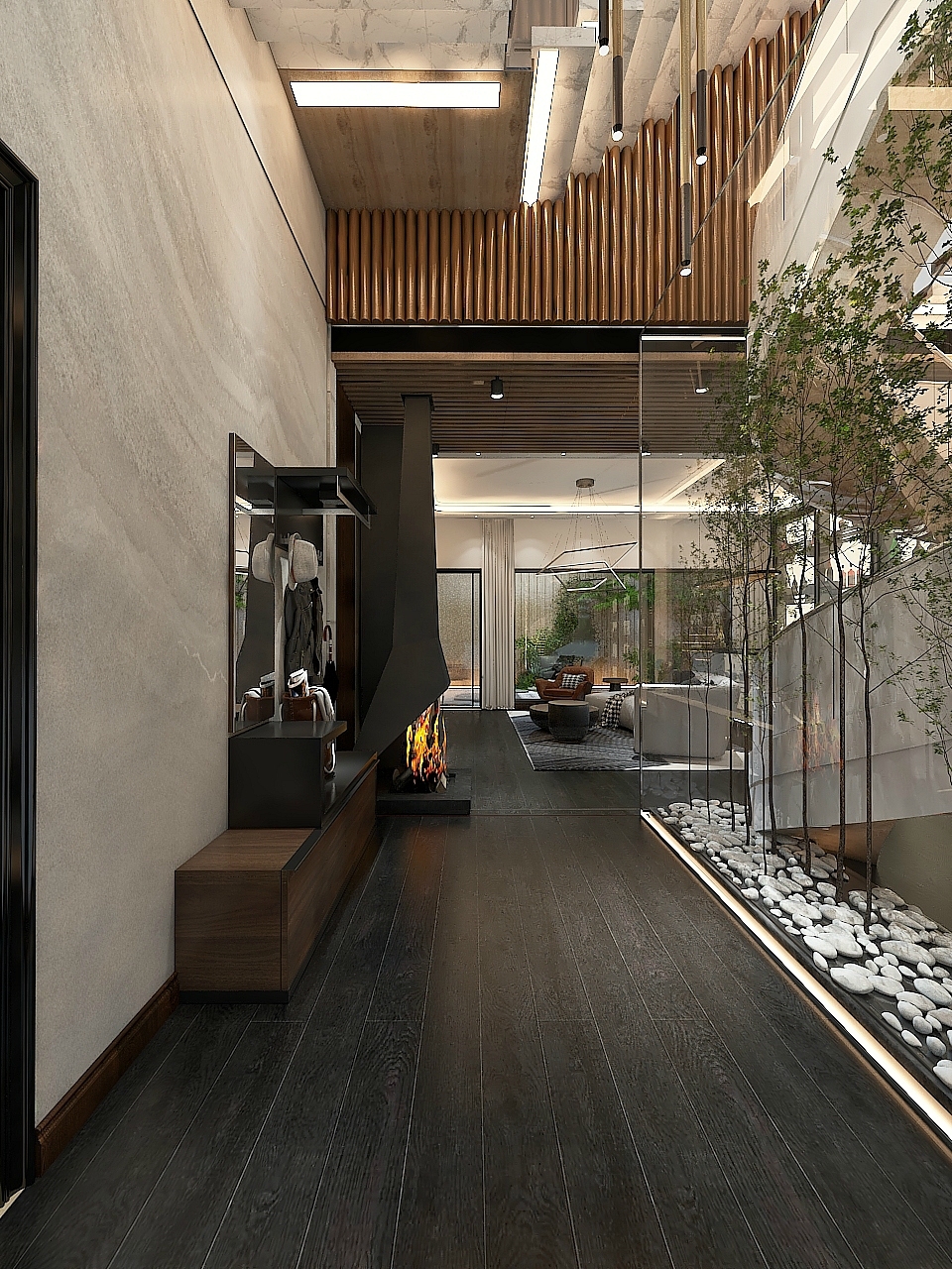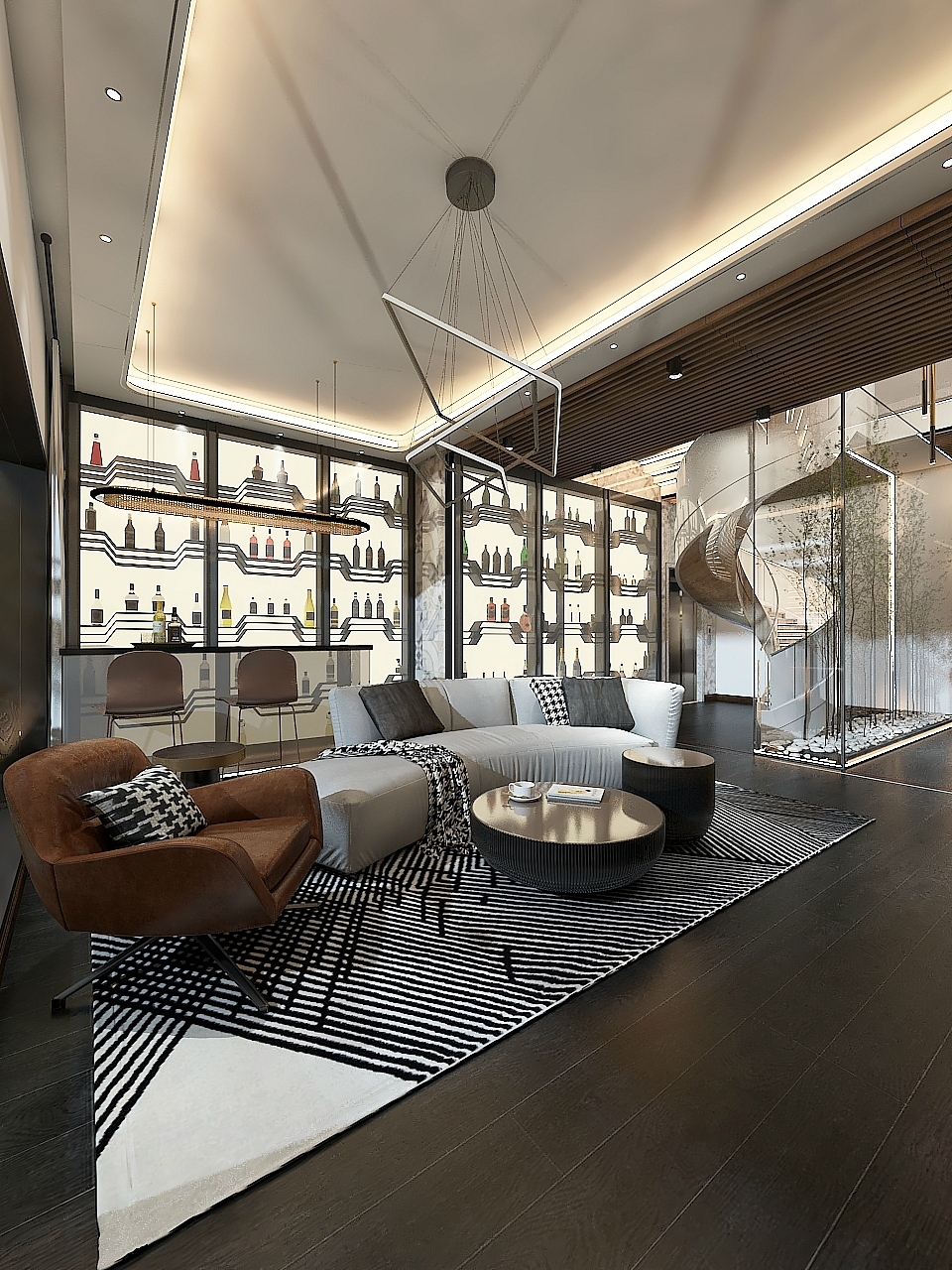 方案設(shè)計理念:THE NEST,翻譯過來是巢,窩的意思。先給予房主一個安樂窩的現(xiàn)代風(fēng)格設(shè)計。地下負一層是一個比較敞開的空間,地下客廳極簡的暗色石磚電視柜組合,搭配上現(xiàn)代的壁爐,進門可見白色鵝卵石觀景樹造型視覺上寬敞明亮。底板采用慕尼黑實木地板。凸顯整體空間的現(xiàn)代質(zhì)感。木紋肌理??蛷d看望露天陽臺區(qū)域運用上落地窗戶。讓陽光投射進室內(nèi)。