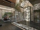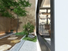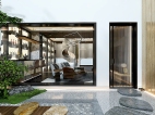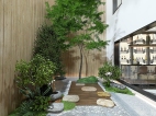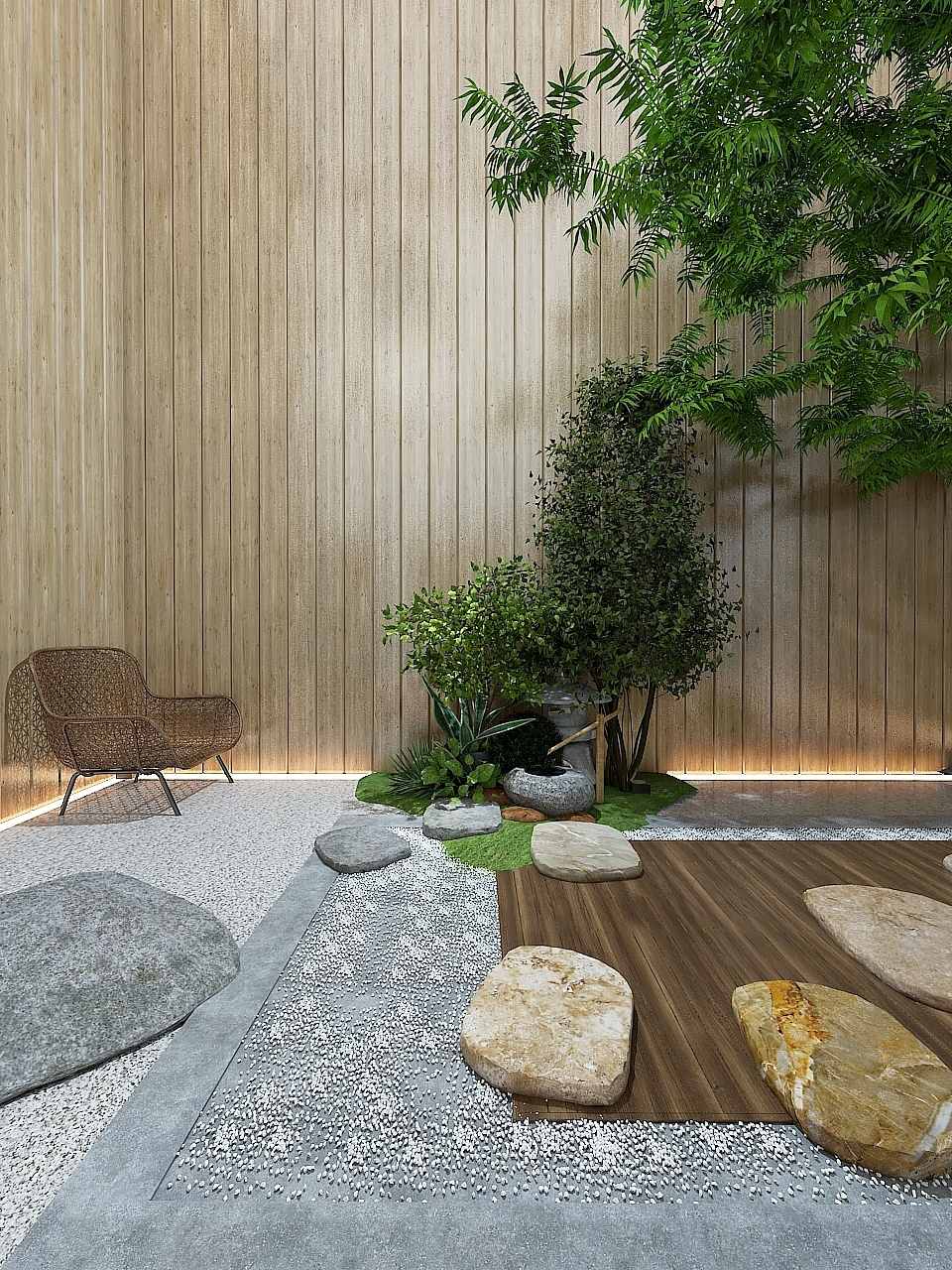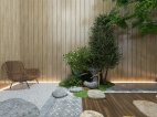 露天陽臺石材采用淺灰色砂石,中間區(qū)域鋪戶外防曬地板。墻面也采用同樣的防曬木材。