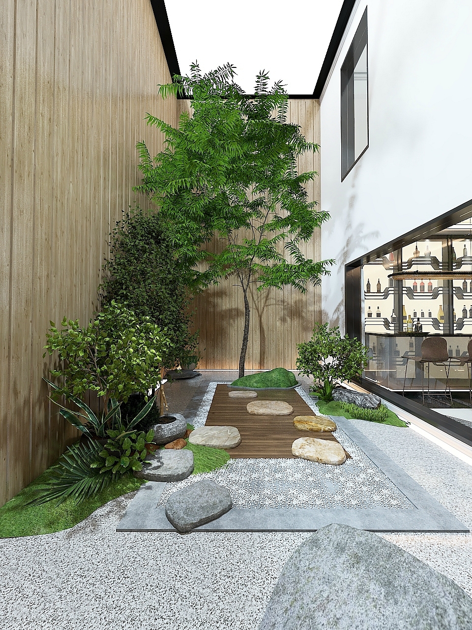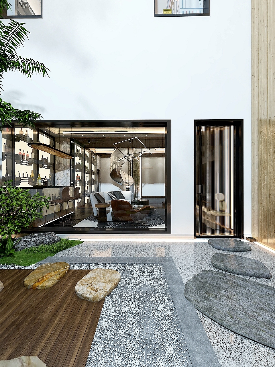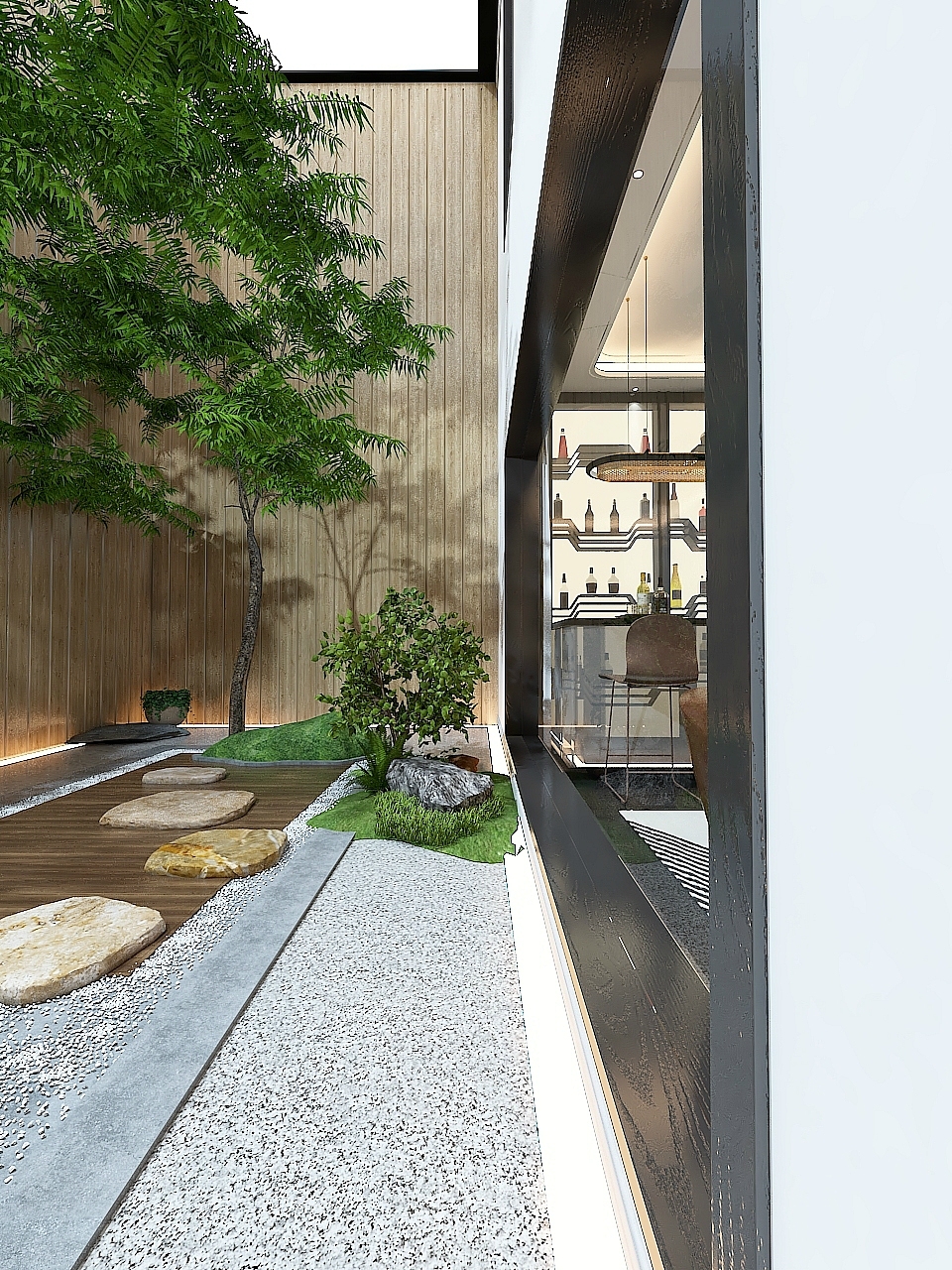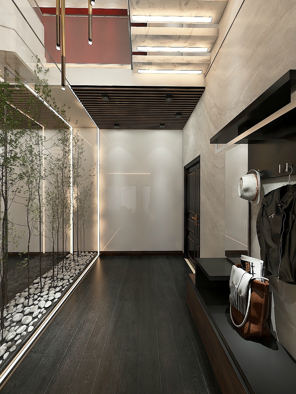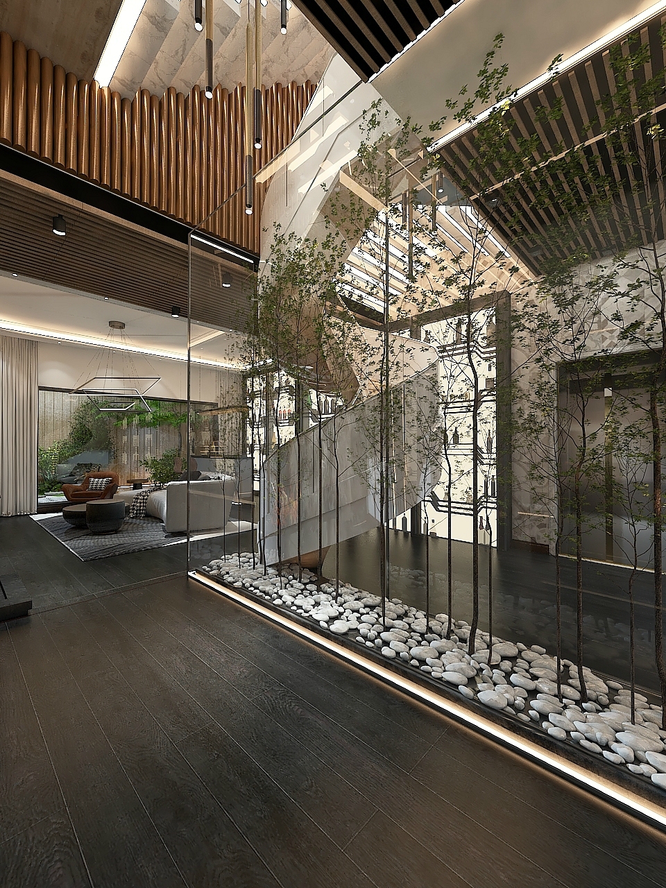 進門可見白色鵝卵石觀景樹造型視覺上寬敞明亮。底板采用慕尼黑實木地板。凸顯整體空間的現(xiàn)代質(zhì)感。木紋肌理。