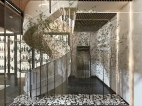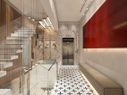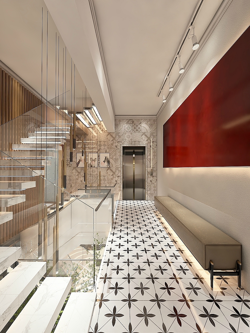 夾層電梯區(qū)域,底板黑白色花式底板。墻面肉色花式類似。一整面紅色漆畫觀賞墻,配上長凳。讓人有一番坐下來欣賞的沖動。