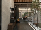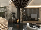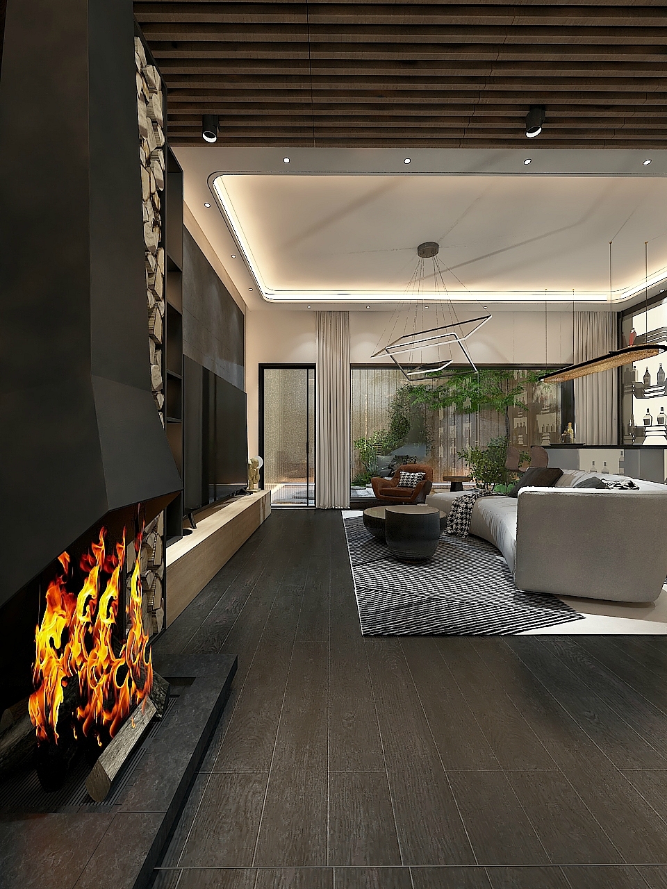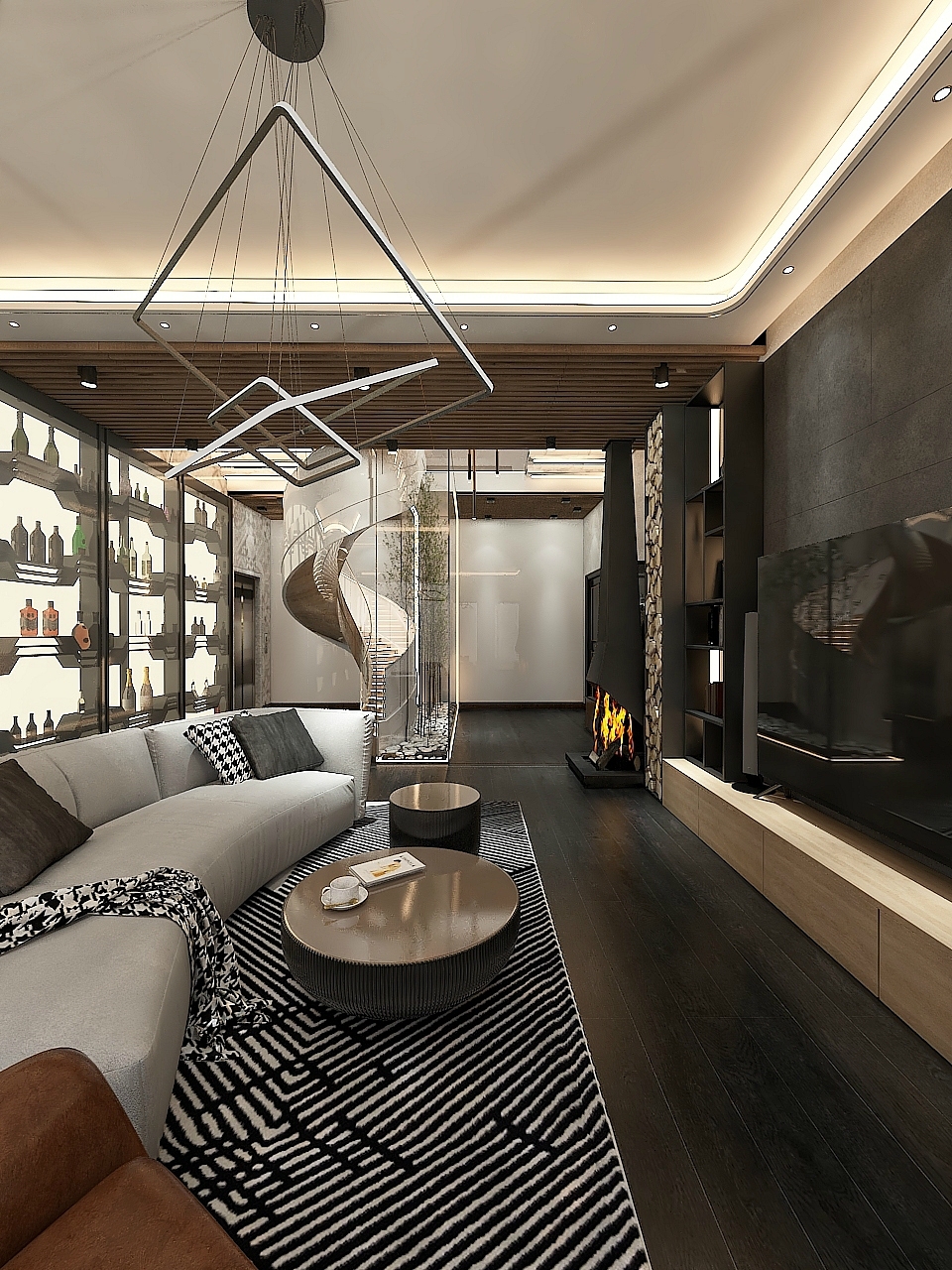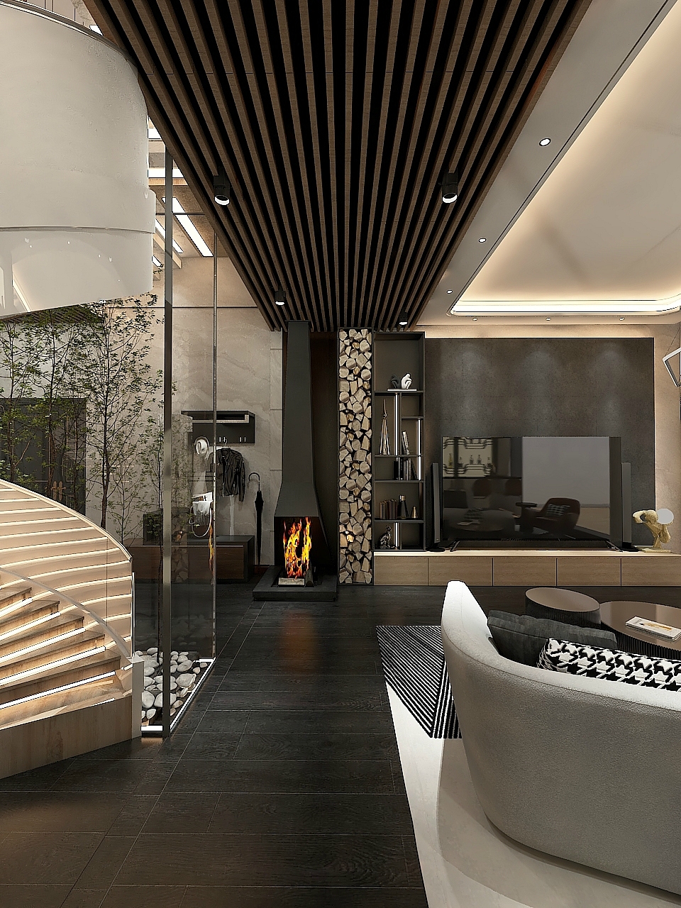 方案設(shè)計理念:THE NEST,翻譯過來是巢,窩的意思。先給予房主一個安樂窩的現(xiàn)代風(fēng)格設(shè)計。地下負一層是一個比較敞開的空間,地下客廳極簡的暗色石磚電視柜組合,搭配上現(xiàn)代的壁爐。